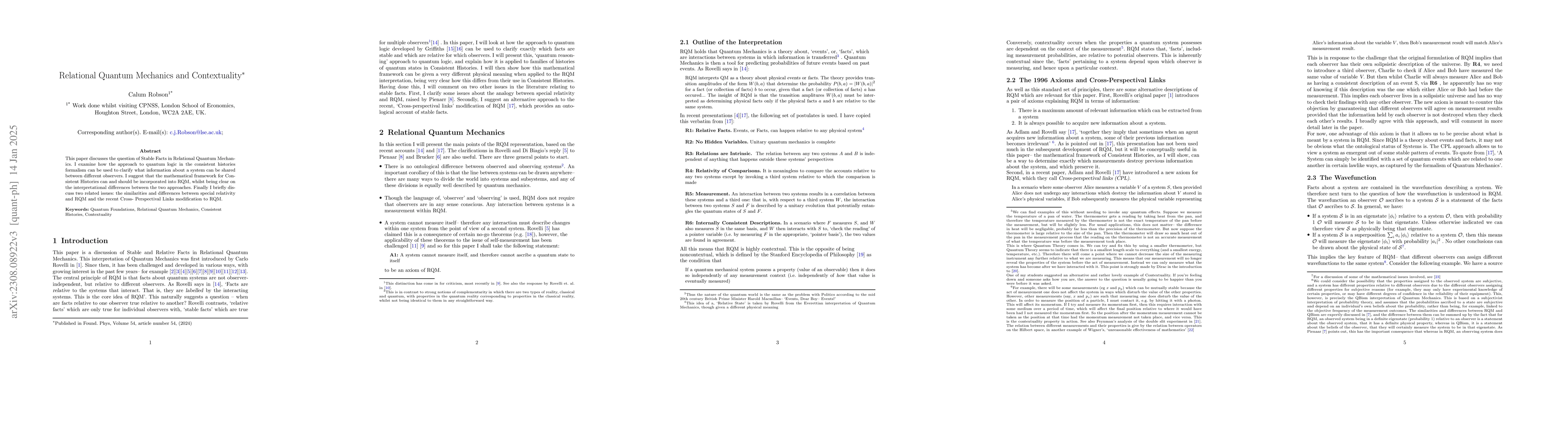 This paper discusses several issues around Relational Quantum Mechanics. First, I discuss possible ontologies underlying the interpretation, before settling on the hypothesis that RQM follows from contextuality of measurements, due to quantum measurements changing the system measured. I then examine how the approach to quantum logic in the consistent histories formalism can be used to clarify which information about a system can be shared between different observers. Finally I discuss the similarities and differences between special relativity and RQM.