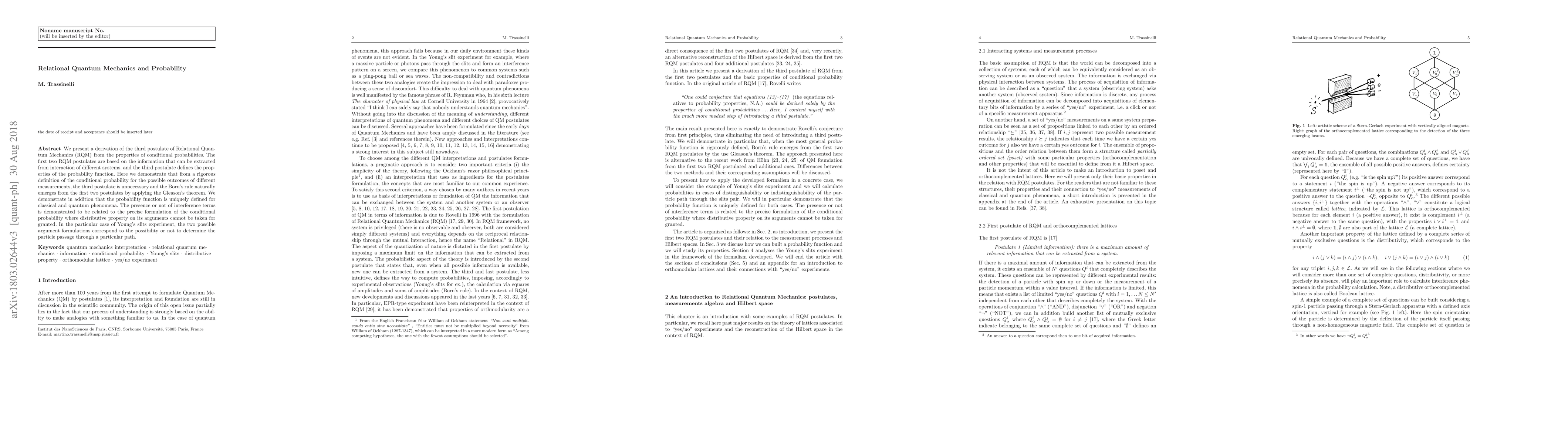 This paper derives the third postulate of Relational Quantum Mechanics (RQM) from conditional probabilities, showing that the Born's rule naturally follows from the first two RQM postulates via Gleason's theorem. It concludes that the probability function is uniquely defined and interference terms depend on the precise formulation of conditional probability.