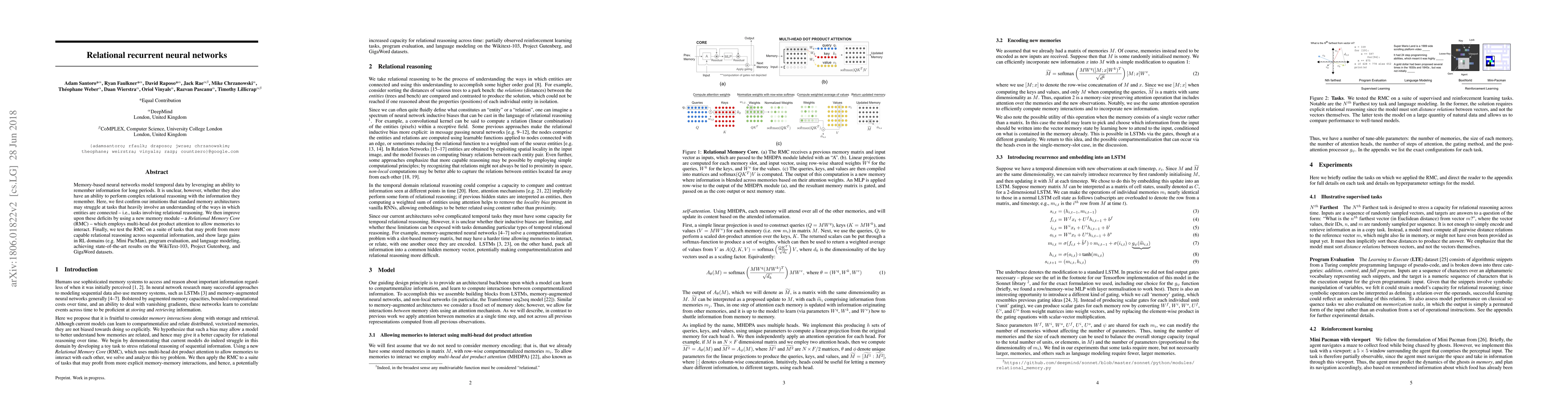 This paper investigates the limitations of memory-based neural networks in relational reasoning tasks and introduces a Relational Memory Core (RMC) that uses multi-head dot product attention to enable memory interactions. The RMC achieves state-of-the-art results in reinforcement learning, program evaluation, and language modeling tasks.