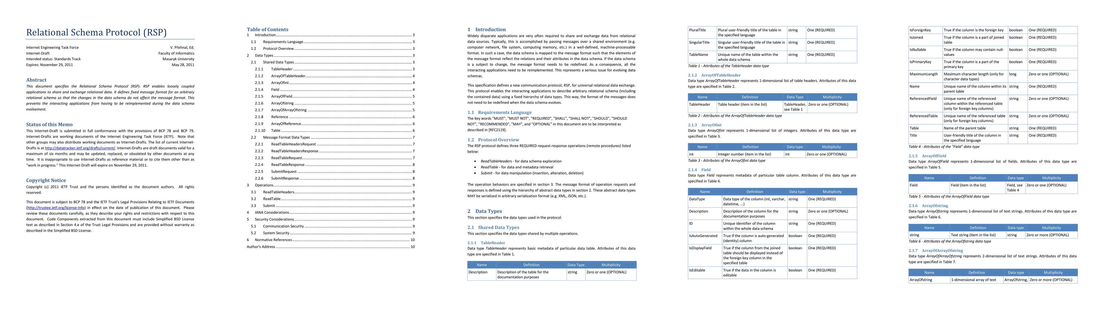 This document specifies the Relational Schema Protocol (RSP). RSP enables loosely coupled applications to share and exchange relational data. It defines fixed message format for an arbitrary relational schema so that the changes in the data schema do not affect the message format. This prevents the interacting applications from having to be reimplemented during the data schema evolvement.