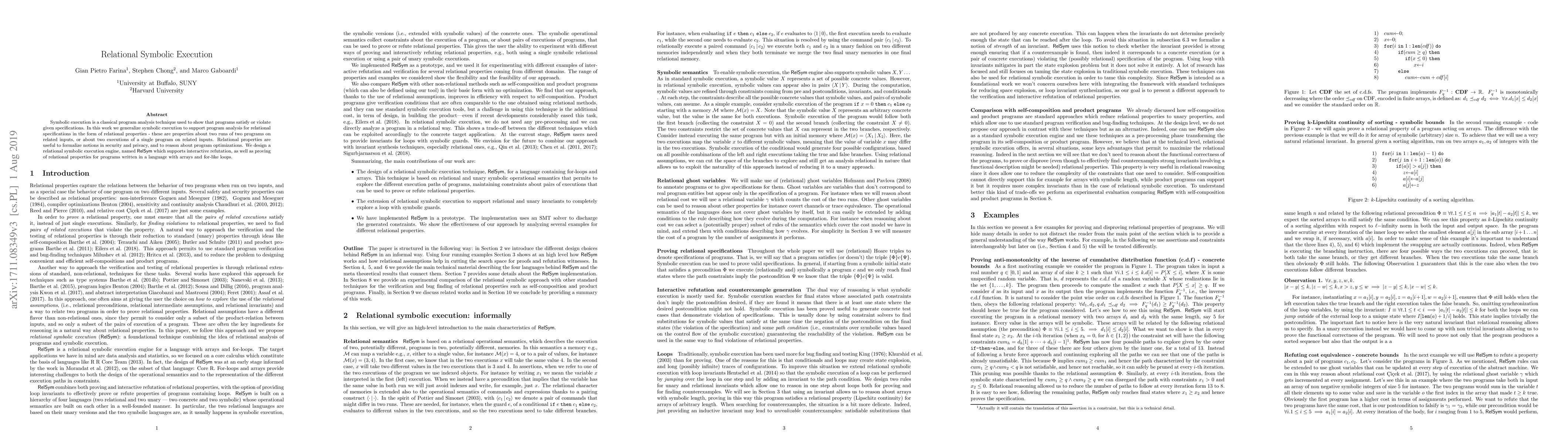 Symbolic execution is a classical program analysis technique used to show that programs satisfy or violate given specifications. In this work we generalize symbolic execution to support program analysis for relational specifications in the form of relational properties - these are properties about two runs of two programs on related inputs, or about two executions of a single program on related inputs. Relational properties are useful to formalize notions in security and privacy, and to reason about program optimizations. We design a relational symbolic execution engine, named RelSym which supports interactive refutation, as well as proving of relational properties for programs written in a language with arrays and for-like loops.