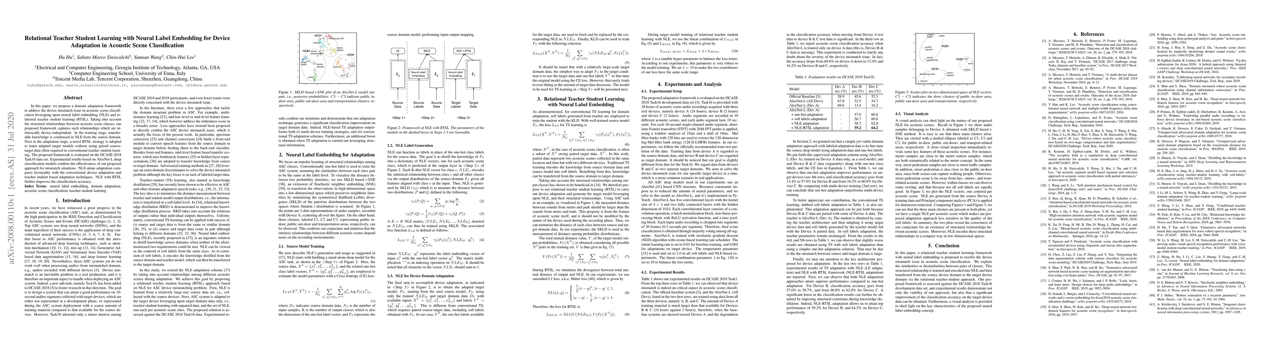 This paper proposes a domain adaptation framework using neural label embedding and relational teacher-student learning to tackle device mismatch in acoustic scene classification. The framework effectively captures device-independent relationships between classes and achieves improved classification accuracy without requiring paired source-target data.