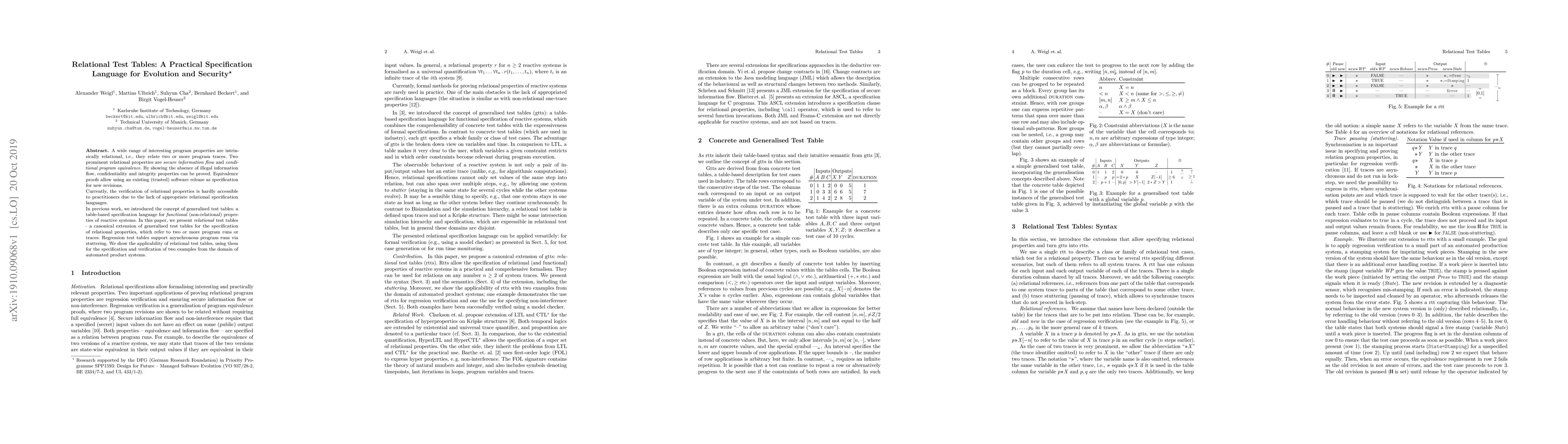 This paper introduces relational test tables, an extension of generalised test tables, to specify and verify relational properties like secure information flow and conditional program equivalence. The authors demonstrate its application through examples in automated product systems, aiming to make verification of such properties more accessible to practitioners.