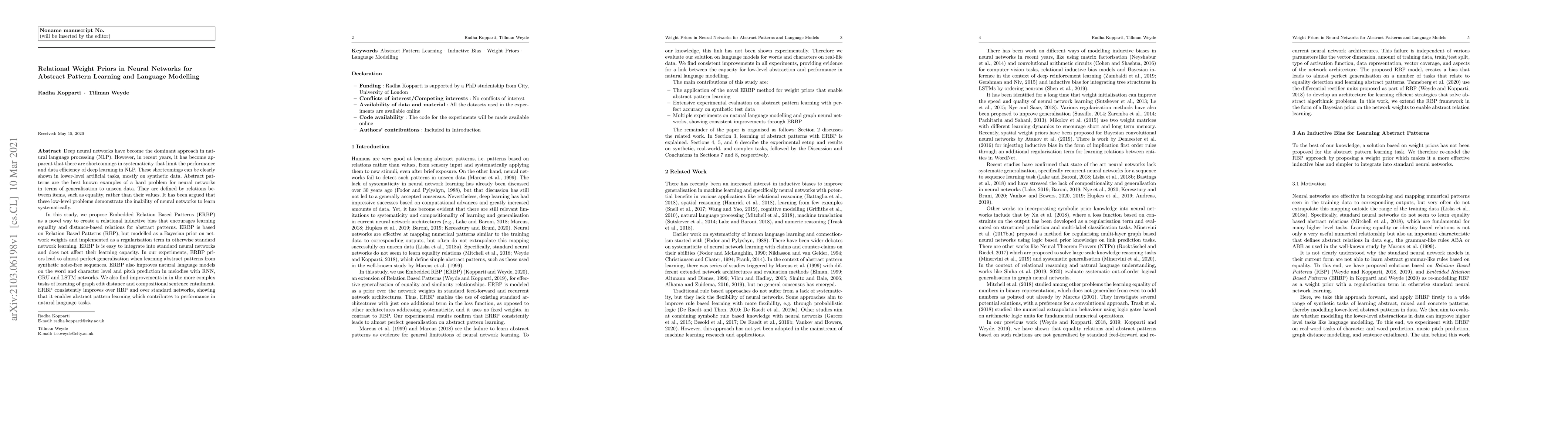 This paper proposes Embedded Relation Based Patterns (ERBP) as a relational inductive bias to enhance neural networks' ability to learn abstract patterns and improve language modelling. ERBP, implemented as a Bayesian prior, significantly boosts generalisation in synthetic tasks and enhances performance in natural language and music prediction tasks.