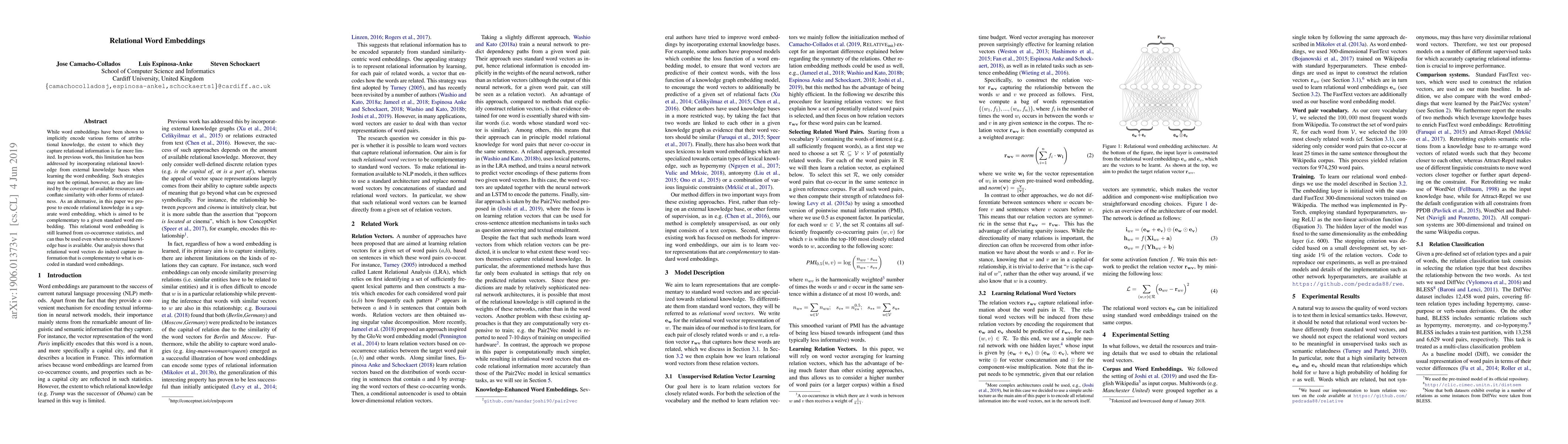 This paper proposes a complementary relational word embedding to capture relational information separately from standard word embeddings, learned purely from co-occurrence statistics, thus addressing the limitations of external knowledge bases and providing a more comprehensive understanding of word relations.