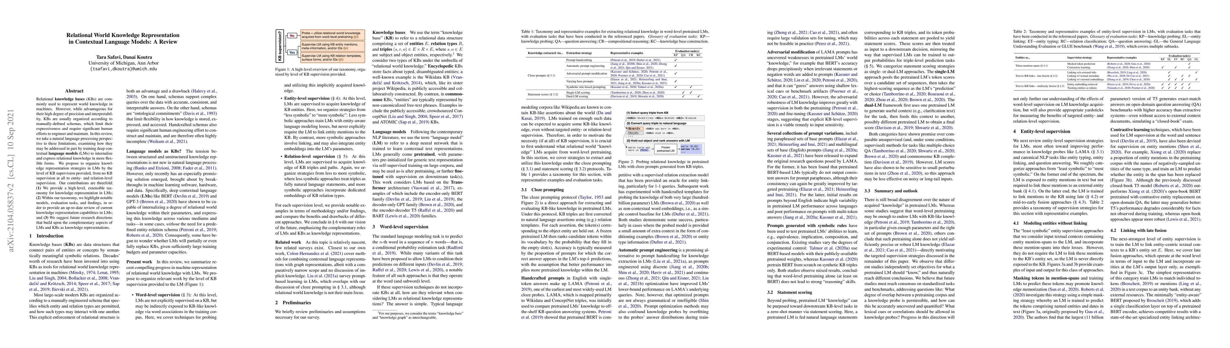 This review examines the limitations of manually-defined relational knowledge bases and explores how deep contextual language models can represent knowledge in more flexible forms. It proposes a taxonomy for knowledge representation in LMs based on KB supervision levels and identifies future research directions combining LMs and KBs.