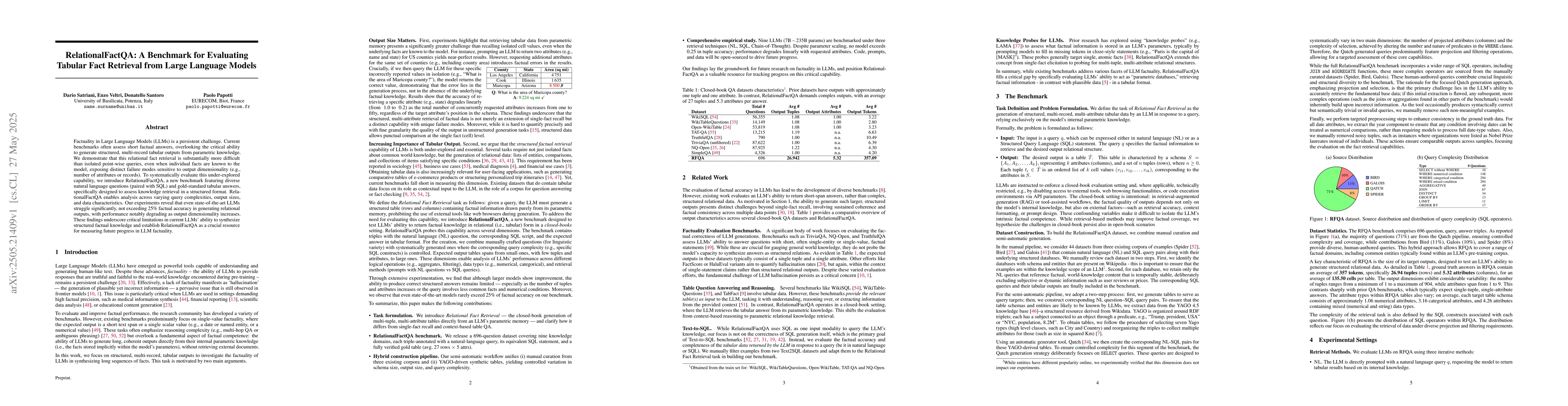 A new benchmark, RelationalFactQA, assesses large language models' ability to generate structured factual knowledge from large datasets, revealing significant limitations in their factuality.