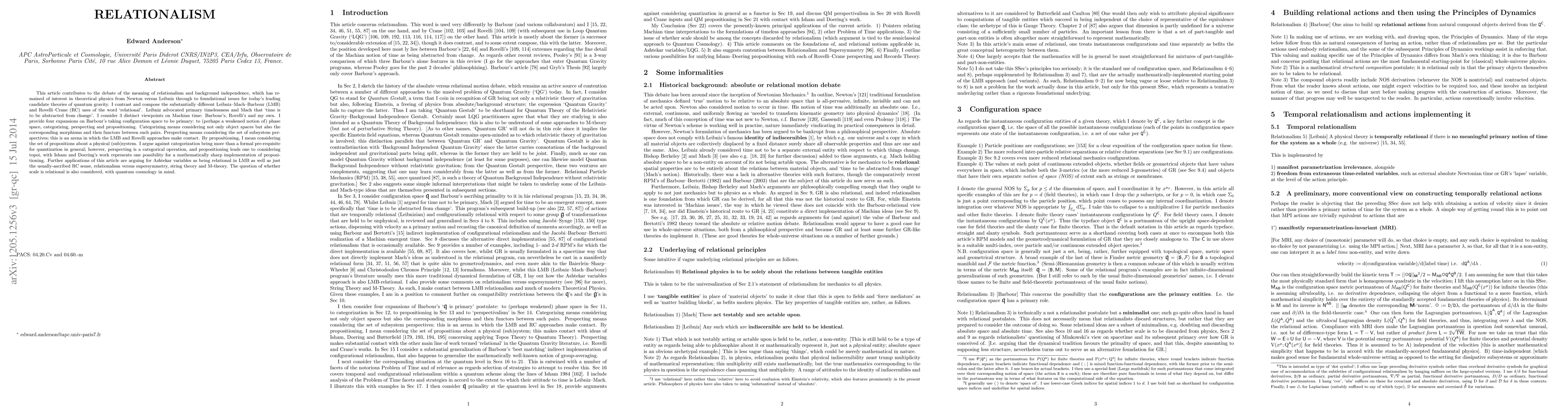 This article contributes to the debate of the meaning of relationalism and background independence, which has remained of interest in theoretical physics from Newton versus Leibniz through to foundational issues for today's leading candidate theories of quantum gravity. I contrast and compose the substantially different Leibniz--Mach--Barbour (LMB) and Rovelli--Crane (RC) uses of the word `relational'. Leibniz advocated primary timelessness and Mach that `time is to be abstracted from change'. I consider 3 distinct viewpoints on Machian time: Barbour's, Rovelli's and my own. I provide four expansions on Barbour's taking configuration space to be primary: to (perhaps a weakened notion of) phase space, categorizing, perspecting and propositioning. Categorizing means considering not only object spaces but also the corresponding morphisms and then functors between such pairs. Perspecting means considering the set of subsystem perspectives; this is an arena in which the LMB and Rovelli approaches make contact. By propositioning, I mean considering the set of propositions about a physical (sub)system. I argue against categorization being more than a formal pre-requisite for quantization in general; however, perspecting is a categorical operation, and propositioning leads one to considering topoi, with Isham and Doering's work represents one possibility for a mathematically sharp implementation of propositioning. Further applications of this article are arguing for Ashtekar variables as being relational in LMB as well as just the usually-ascribed RC sense, relationalism versus supersymmetry, string theory and M-theory. The question of whether scale is relational is also considered, with quantum cosmology in mind.