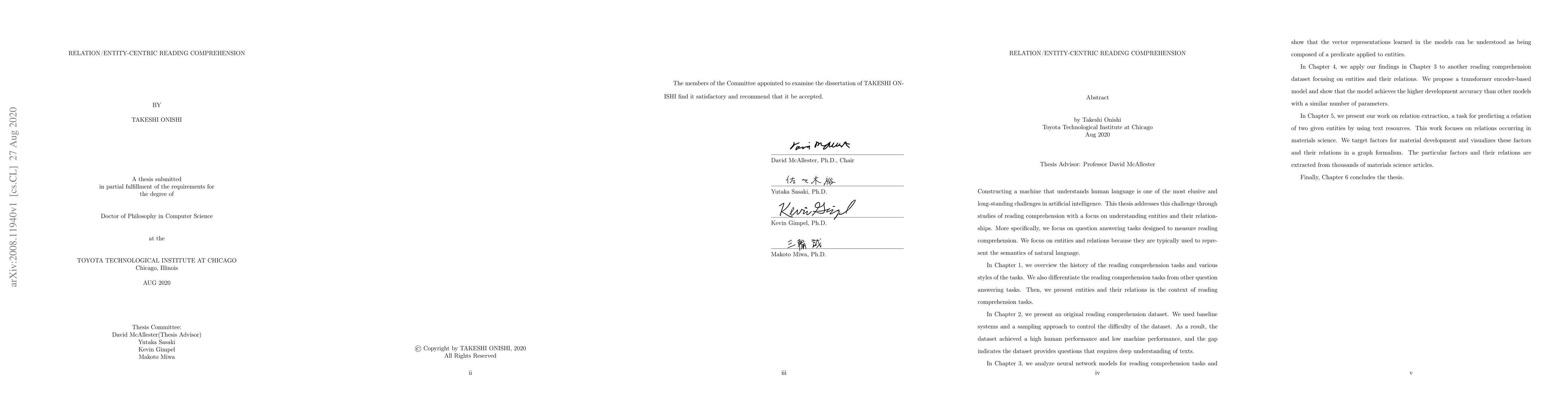 Constructing a machine that understands human language is one of the most elusive and long-standing challenges in artificial intelligence. This thesis addresses this challenge through studies of reading comprehension with a focus on understanding entities and their relationships. More specifically, we focus on question answering tasks designed to measure reading comprehension. We focus on entities and relations because they are typically used to represent the semantics of natural language.