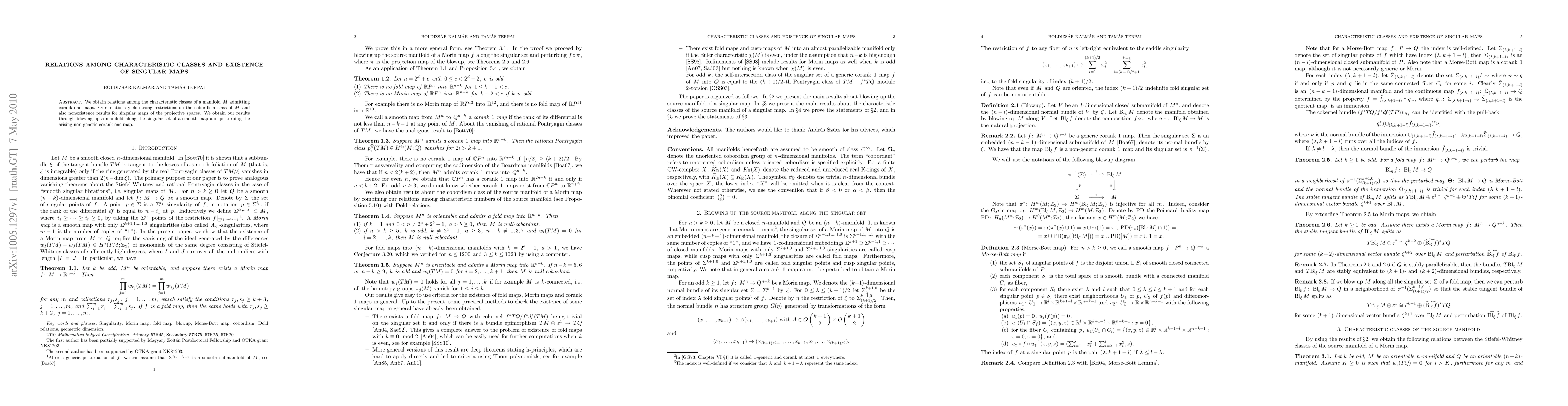 This paper establishes connections between characteristic classes on a manifold M allowing corank one maps, revealing constraints on M's cobordism class and proving the nonexistence of certain singular maps in projective spaces, achieved by blowing up the manifold along a smooth map's singular set and perturbing the resulting non-generic corank one map.