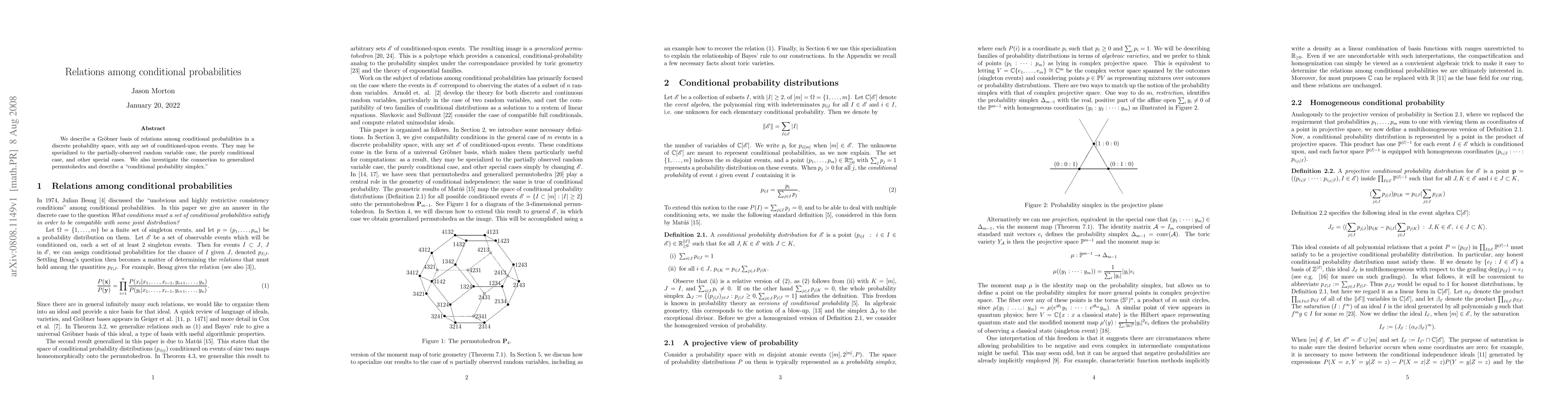 This paper presents a Groebner basis for relations among conditional probabilities in discrete probability spaces, applicable to various scenarios including partially-observed and purely conditional cases. It also explores the link to generalized permutohedra and introduces a conditional probability simplex.