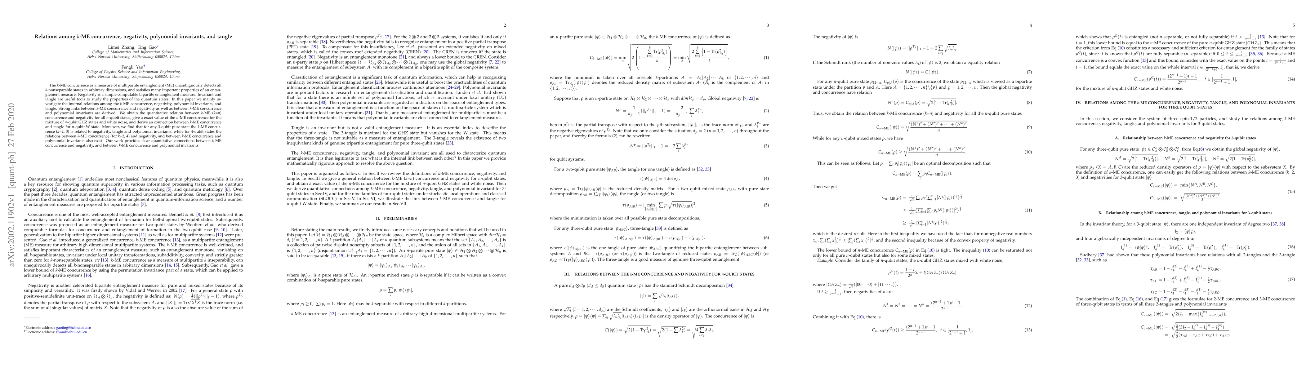 This paper investigates the relationships between $k$-ME concurrence, negativity, polynomial invariants, and tangle as measures of multipartite entanglement. It establishes strong links between $k$-ME concurrence and negativity, providing a quantitative relation for $n$-qubit states, and derives connections between $k$-ME concurrence and tangle for specific quantum states.