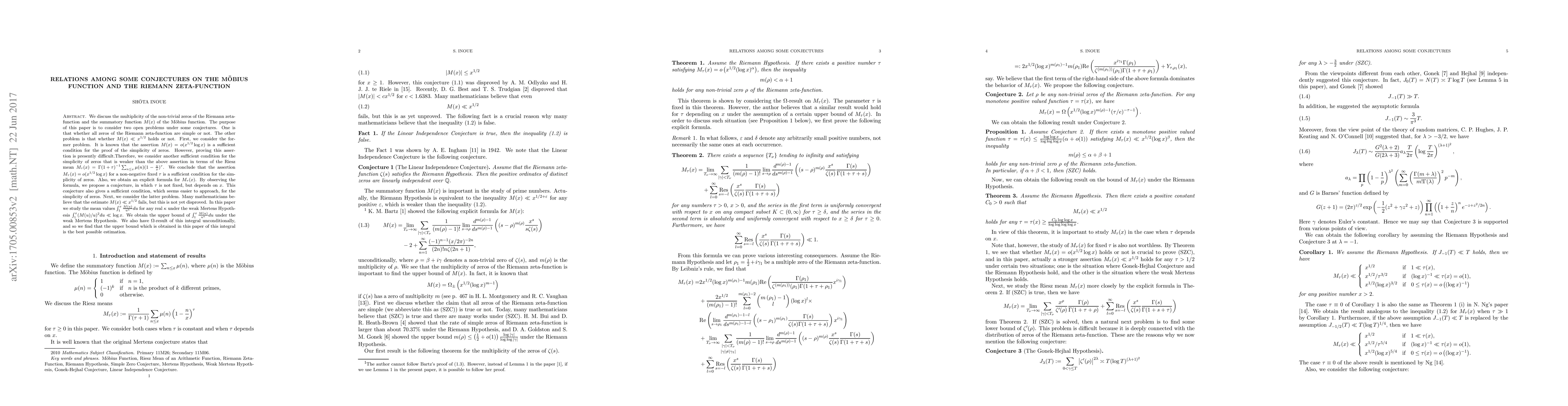 This paper explores conjectures about the M"obius function and Riemann zeta-function, focusing on the multiplicity of zeros and the growth rate of summatory functions, with implications for understanding open problems in number theory.
