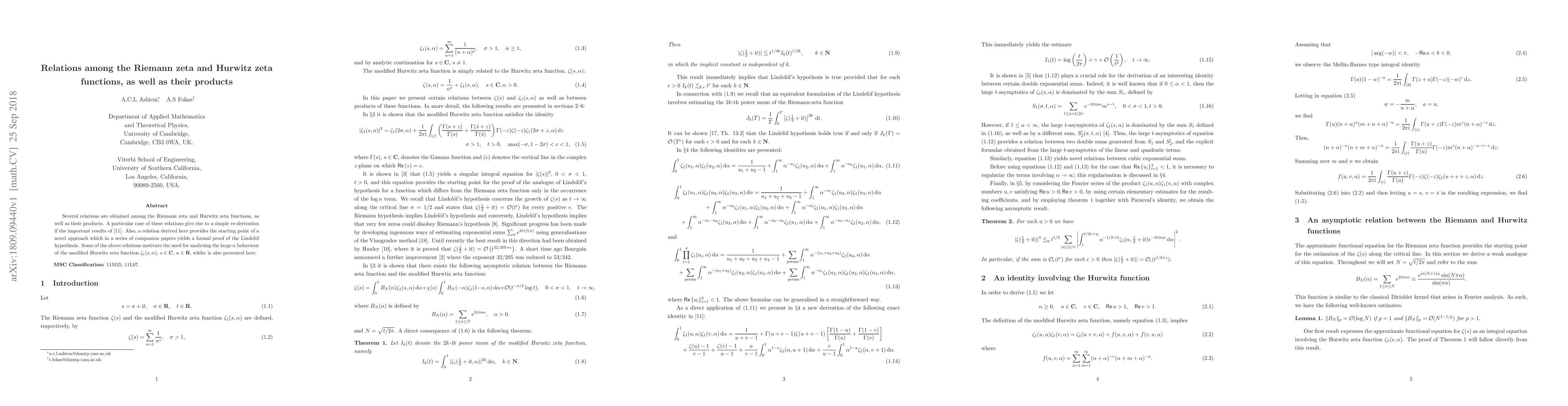 Several relations are obtained among the Riemann zeta and Hurwitz zeta functions, as well as their products. A particular case of these relations give rise to a simple re-derivation if the important results of [11]. Also, a relation derived here provides the starting point of a novel approach which in a series of companion papers yields a formal proof of the Lindel\"{o}f hypothesis. Some of the above relations motivate the need for analysing the large $\alpha$ behaviour of the modified Hurwitz zeta function $\zeta_1(s,\alpha)$, $s\in \mathbf{C}$, $\alpha\in \mathbf{R}$, which is also presented here.