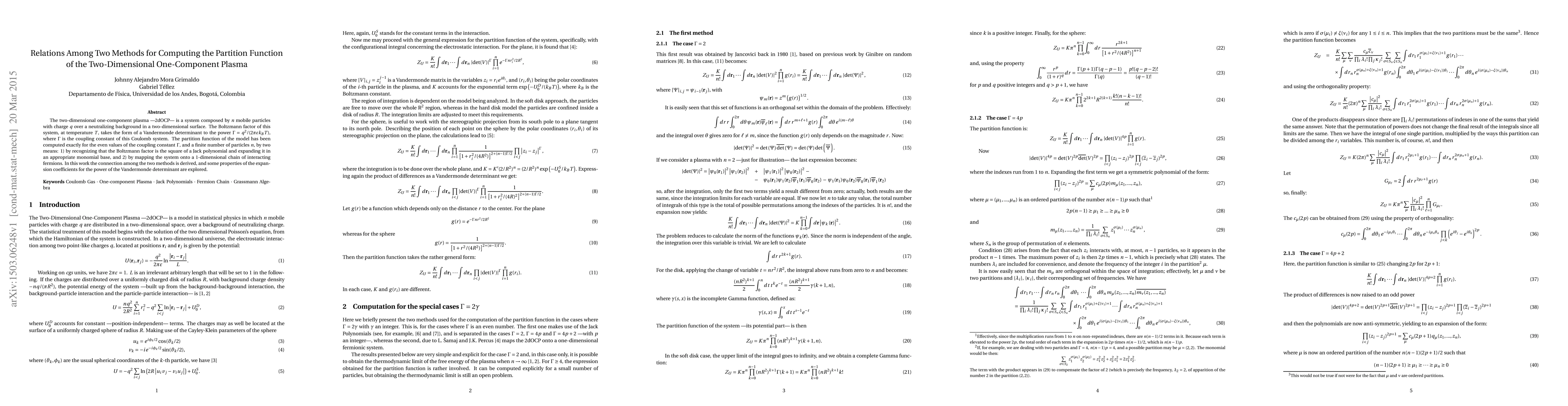 This paper explores the relationship between two methods for computing the partition function of the two-dimensional one-component plasma (2dOCP), showing that both methods—one based on Jack polynomials and the other on mapping to fermions—yield equivalent results. It also investigates properties of the expansion coefficients derived from the Vandermonde determinant.