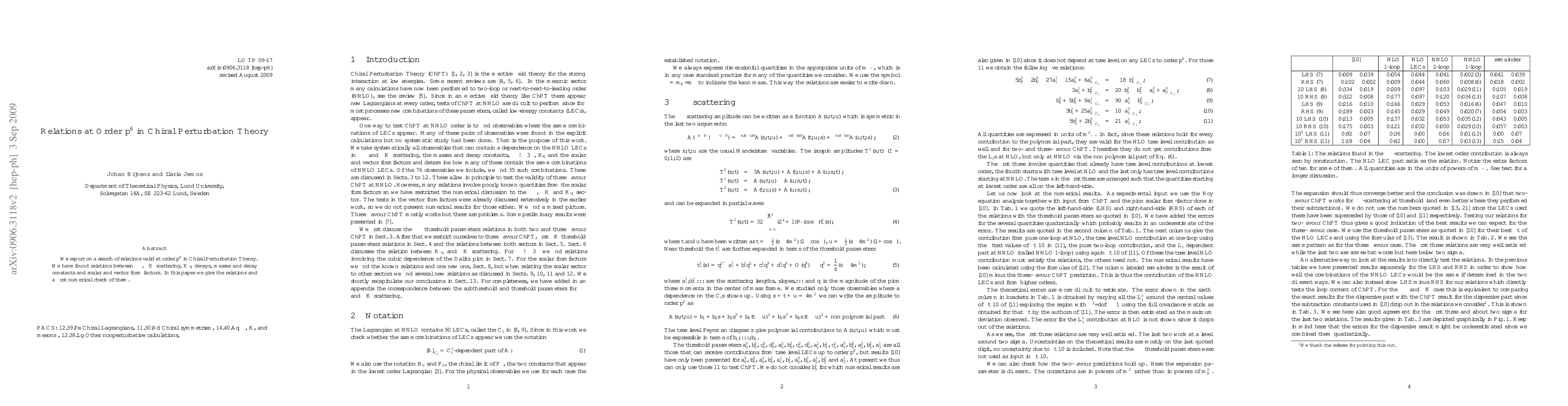We report on a search of relations valid at order $p^6$ in Chiral Perturbation Theory. We have found relations between $\pi\pi$, $\pi K$ scattering, $K_{\ell4}$ decays, masses and decay constants and scalar and vector form factors. In this paper we give the relations and a first numerical check of them.