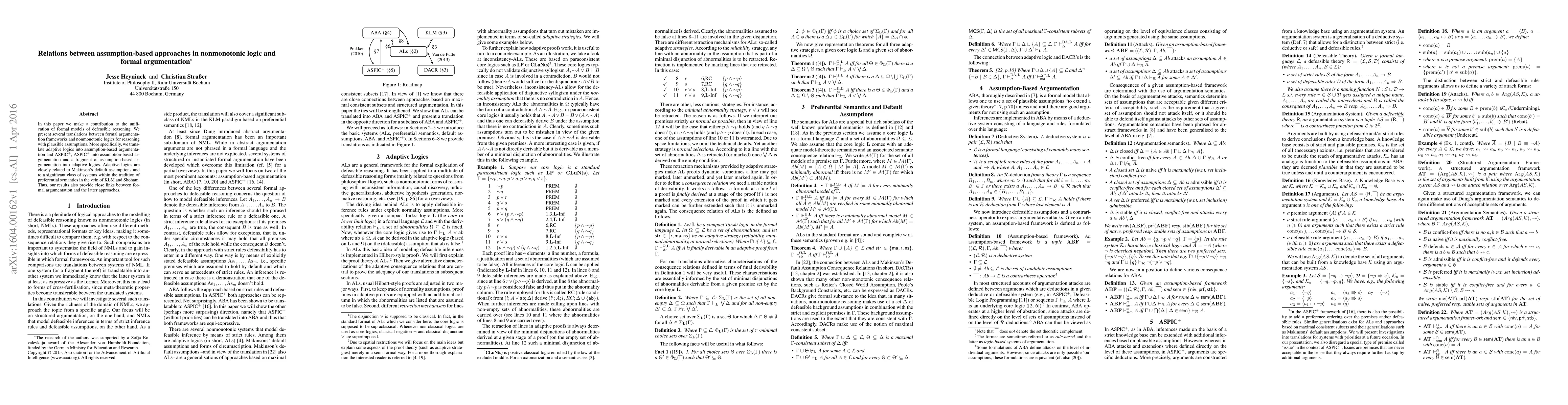 This paper unifies formal models of defeasible reasoning by translating between formal argumentation frameworks and nonmonotonic logics, specifically focusing on adaptive logics and assumption-based argumentation (ABA). It establishes connections between ABA, ASPIC+, and adaptive logics, thereby linking formal argumentation with default reasoning and preferential semantics.