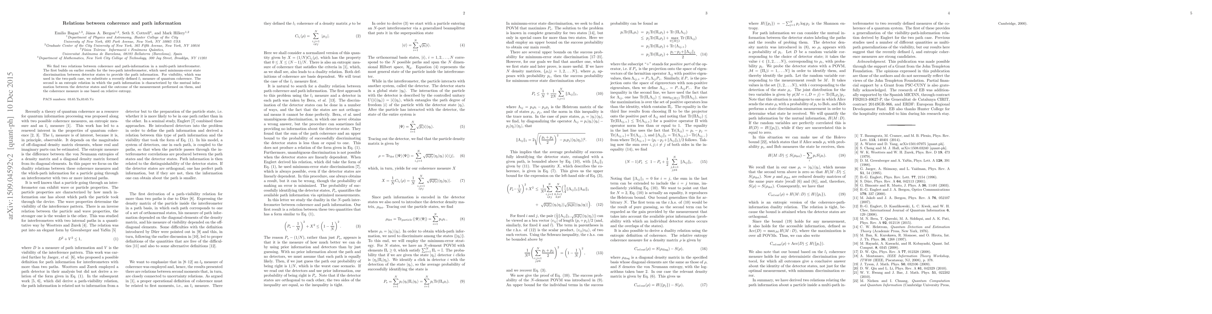 This paper explores two relationships between coherence and path information in a multi-path interferometer, substituting an $l_{1}$ measure of quantum coherence for visibility and establishing an entropic relation based on mutual information and relative entropy.