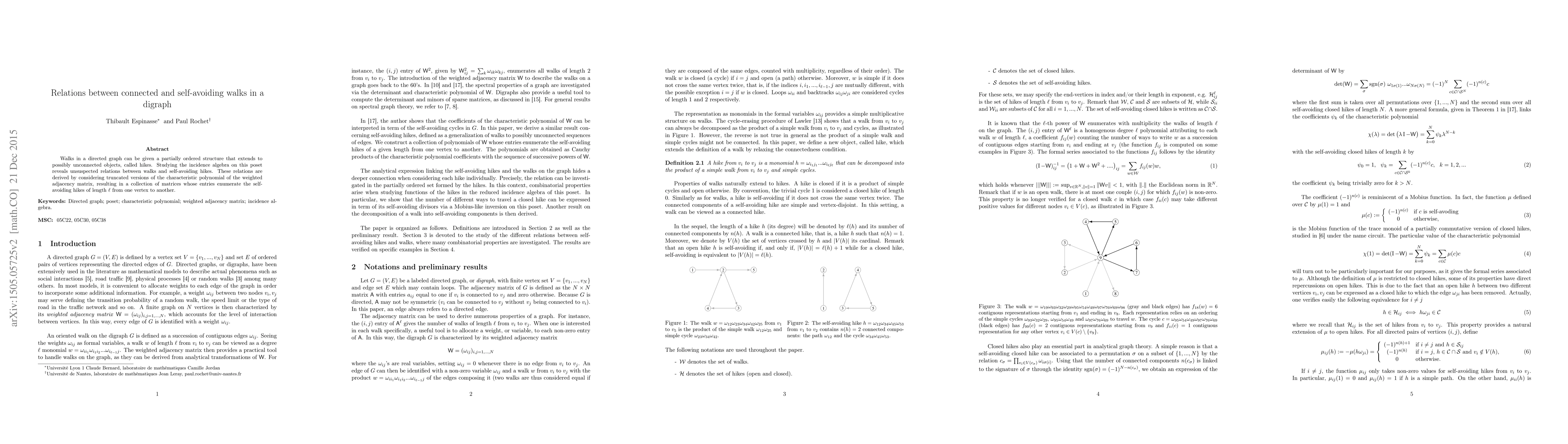 Walks in a directed graph can be given a partially ordered structure that extends to possibly unconnected objects, called hikes. Studying the incidence algebra on this poset reveals unsuspected relations between walks and self-avoiding hikes. These relations are derived by considering truncated versions of the characteristic polynomial of the weighted adjacency matrix, resulting in a collection of matrices whose entries enumerate the self-avoiding hikes of length $\ell$ from one vertex to another.
