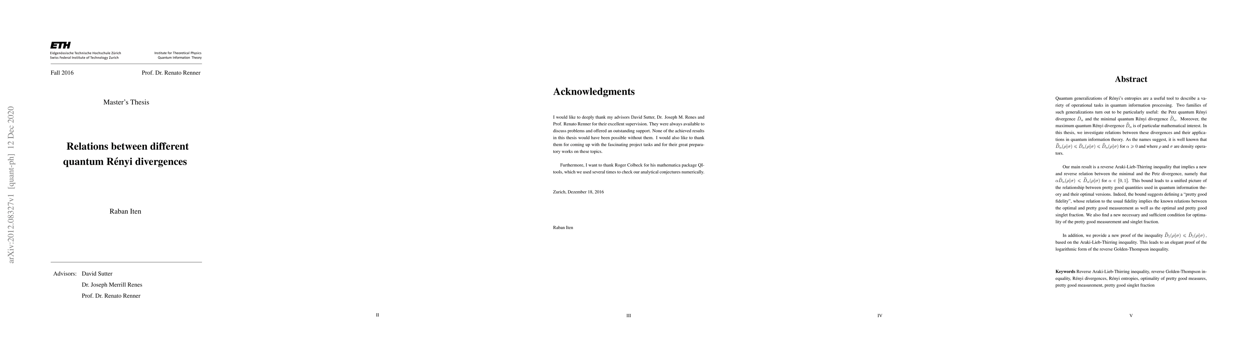 Quantum generalizations of R\'enyi's entropies are a useful tool to describe a variety of operational tasks in quantum information processing. Two families of such generalizations turn out to be particularly useful: the Petz quantum R\'enyi divergence $\bar{D}_{\alpha}$ and the minimal quantum R\'enyi divergence $\widetilde{D}_{\alpha}$. Moreover, the maximum quantum R\'enyi divergence $\widehat{D}_{\alpha}$ is of particular mathematical interest. In this Master thesis, we investigate relations between these divergences and their applications in quantum information theory. Our main result is a reverse Araki-Lieb-Thirring inequality that implies a new relation between the minimal and the Petz divergence, namely that $\alpha \bar{D}_{\alpha}(\rho \| \sigma) \leqslant \widetilde{D}_{\alpha}(\rho \| \sigma)$ for $\alpha \in [0,1]$ and where $\rho$ and $\sigma$ are density operators. This bound suggests defining a "pretty good fidelity", whose relation to the usual fidelity implies the known relations between the optimal and pretty good measurement as well as the optimal and pretty good singlet fraction. In addition, we provide a new proof of the inequality $\widetilde{D}_{1}(\rho \| \sigma) \leqslant \widehat{D}_{1}(\rho \| \sigma)\, ,$ based on the Araki-Lieb-Thirring inequality. This leads to an elegant proof of the logarithmic form of the reverse Golden-Thompson inequality.