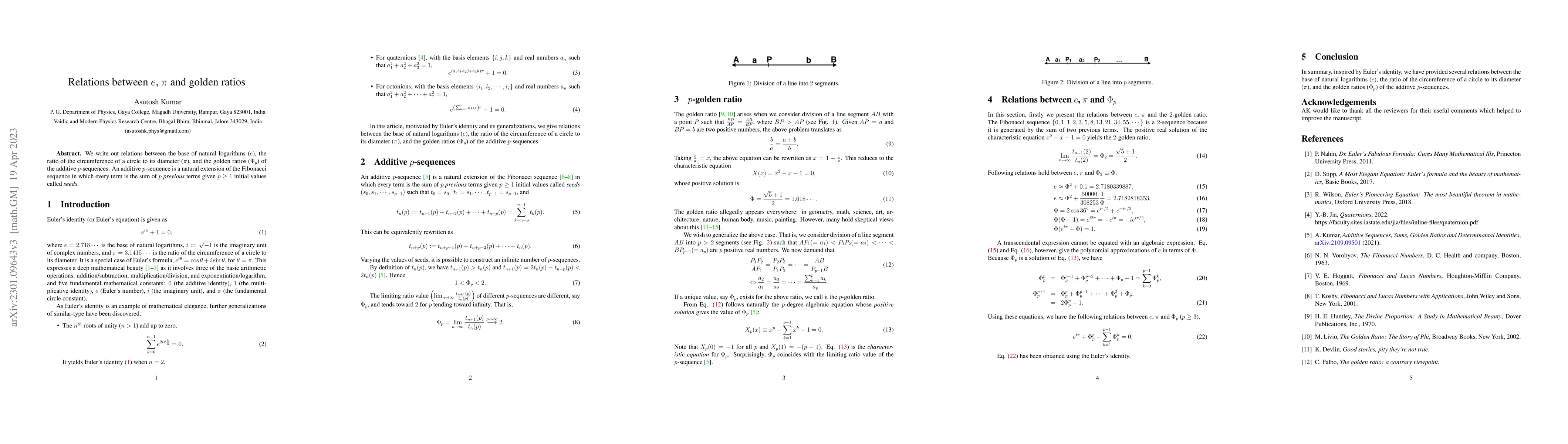We write out relations between the base of natural logarithms ($e$), the ratio of the circumference of a circle to its diameter ($\pi$), and the golden ratios ($\Phi_p$) of the additive $p$-sequences. An additive $p$-sequence is a natural extension of the Fibonacci sequence in which every term is the sum of $p$-previous terms given $p \ge 1$ initial values called seeds.
