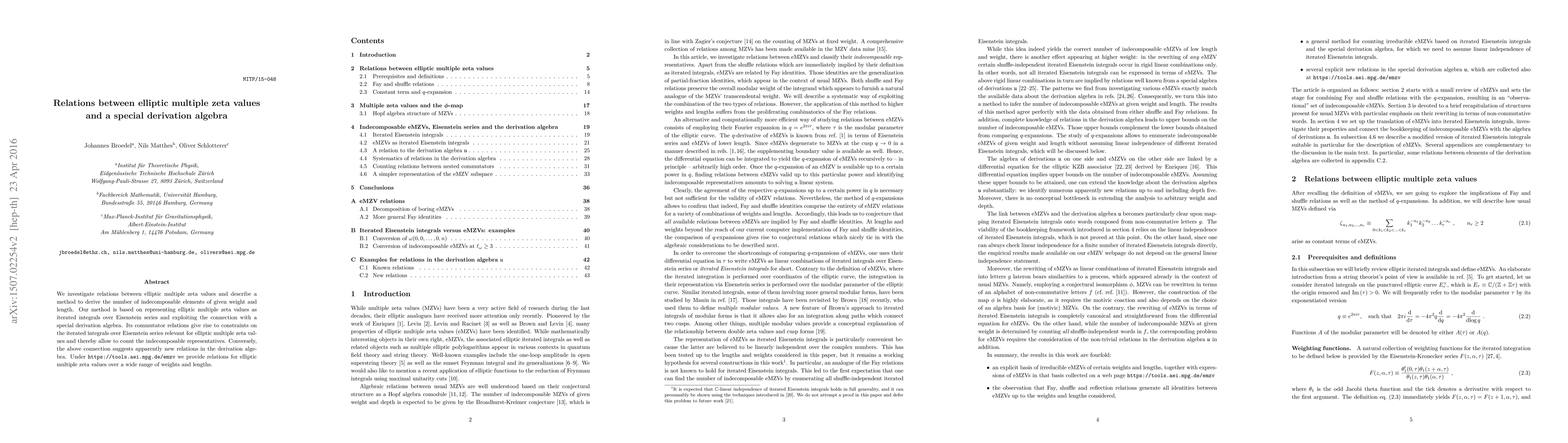We investigate relations between elliptic multiple zeta values and describe a method to derive the number of indecomposable elements of given weight and length. Our method is based on representing elliptic multiple zeta values as iterated integrals over Eisenstein series and exploiting the connection with a special derivation algebra. Its commutator relations give rise to constraints on the iterated integrals over Eisenstein series relevant for elliptic multiple zeta values and thereby allow to count the indecomposable representatives. Conversely, the above connection suggests apparently new relations in the derivation algebra. Under https://tools.aei.mpg.de/emzv we provide relations for elliptic multiple zeta values over a wide range of weights and lengths.