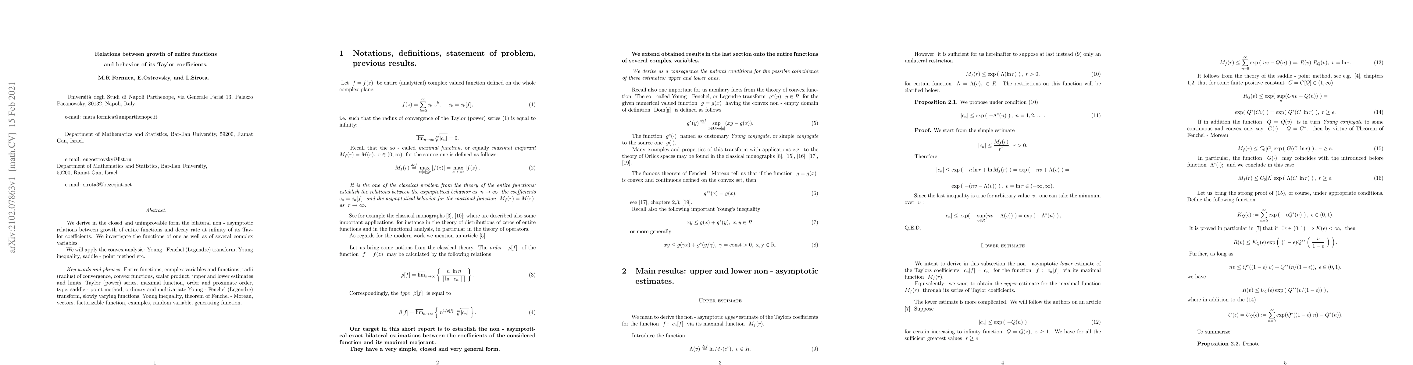 Summary: This paper establishes non-asymptotic, closed-form relations between the growth of entire functions and the decay rate of their Taylor coefficients, employing tools from convex analysis such as the Young-Fenchel transform and saddle-point method for both single and multiple complex variables.