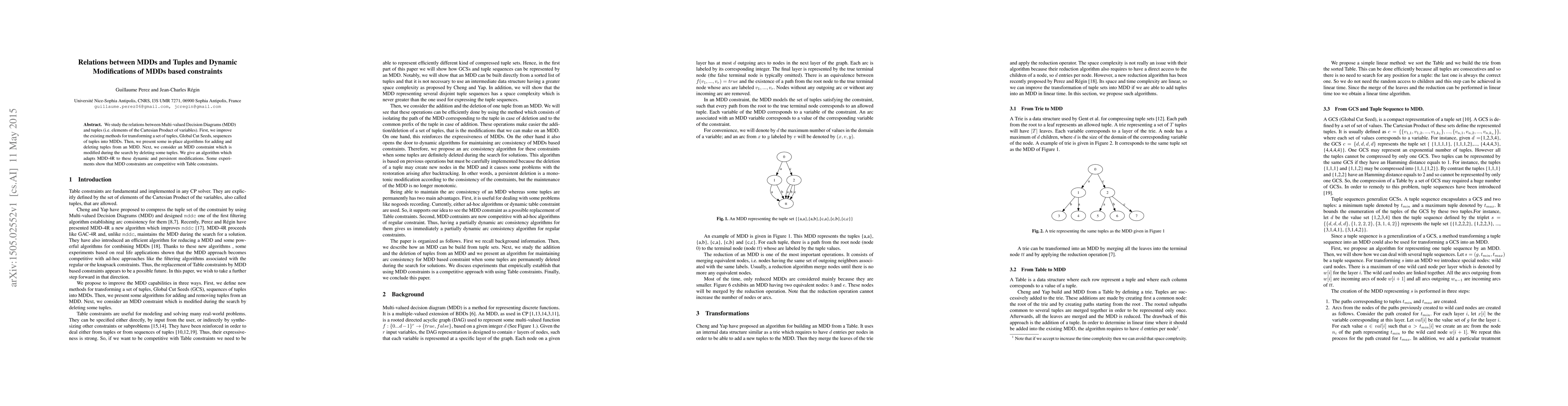 We study the relations between Multi-valued Decision Diagrams (MDD) and tuples (i.e. elements of the Cartesian Product of variables). First, we improve the existing methods for transforming a set of tuples, Global Cut Seeds, sequences of tuples into MDDs. Then, we present some in-place algorithms for adding and deleting tuples from an MDD. Next, we consider an MDD constraint which is modified during the search by deleting some tuples. We give an algorithm which adapts MDD-4R to these dynamic and persistent modifications. Some experiments show that MDD constraints are competitive with Table constraints.