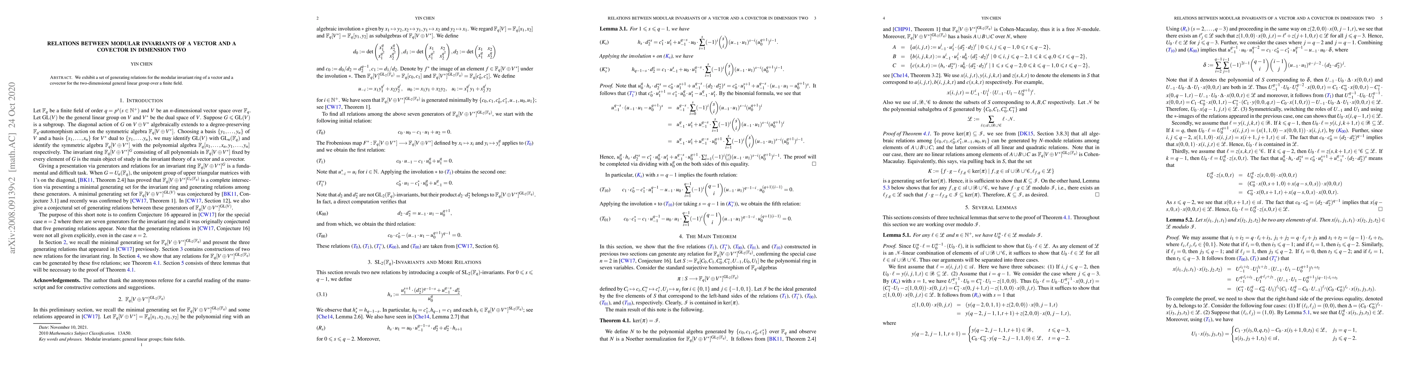 We exhibit a set of generating relations for the modular invariant ring of a vector and a covector for the two-dimensional general linear group over a finite field.