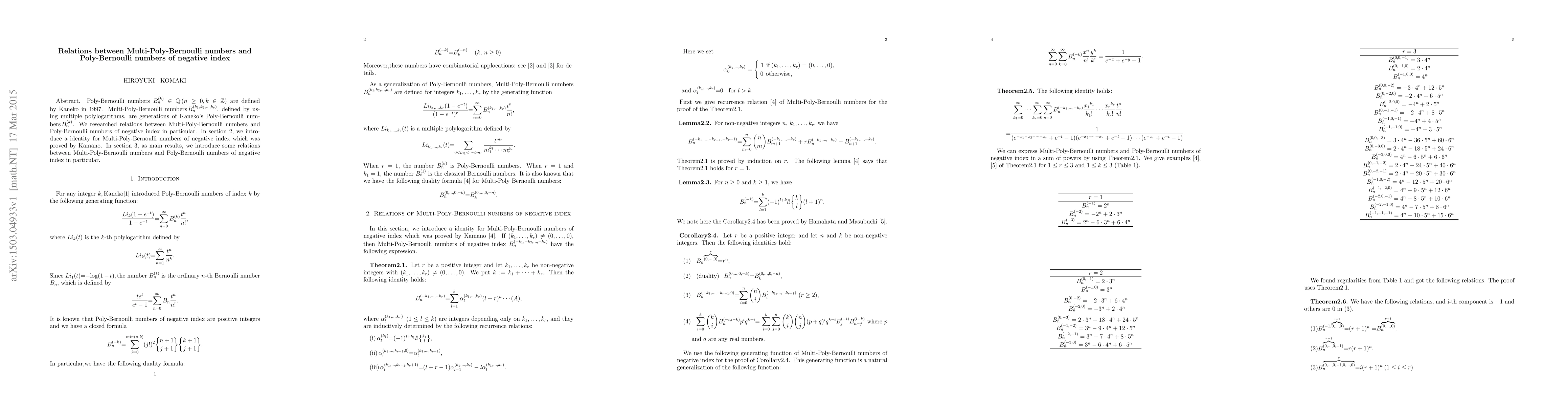 This paper explores the connections between Multi-Poly-Bernoulli numbers and Poly-Bernoulli numbers, specifically focusing on relations involving Poly-Bernoulli numbers of negative index. It introduces an identity for negative index Multi-Poly-Bernoulli numbers and derives key relationships between these number systems.