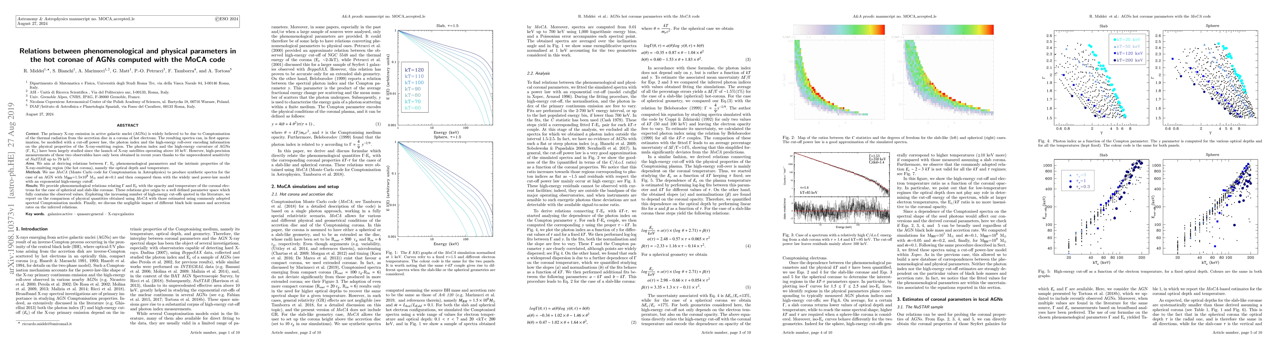 The primary X-ray emission in active galactic nuclei (AGNs) is widely believed to be due to Comptonisation of the thermal radiation from the accretion disc in a corona of hot electrons. The resulting spectra can, in first approximation, be modelled with a cut-off power law, the photon index and the high-energy roll-over encoding information on the physical properties of the X-ray-emitting region. The photon index and the high-energy curvature of AGNs ($\Gamma$, E$_c$) have been largely studied since the launch of X-ray satellites operating above 10 keV. However, high-precision measurements of these two observables have only been obtained in recent years thanks to the unprecedented sensitivity of NuSTAR up to 79 keV. We aim at deriving relations between phenomenological parameters ($\Gamma$ and E$_c$) and the intrinsic properties of the X-ray-emitting region (the hot corona), namely the optical depth and temperature. We use MoCA (Monte Carlo code for Comptonisation in Astrophysics) to produce synthetic spectra for the case of an AGN with M$_{BH}$=1.5$\times$10$^8$ M$_{sun}$ and accretion rate of 10% and then compared them with the widely used power-law model with an exponential high-energy cutoff. We provide phenomenological relations relating $\Gamma$ and E$_c$ with the opacity and temperature of the coronal electrons for the case of spherical and slab-like coronae. These relations give origin to a well defined parameter space which fully contains the observed values. Exploiting the increasing number of high-energy cut-offs quoted in the literature, we report on the comparison of physical quantities obtained using MoCA with those estimated using commonly adopted spectral Comptonisation models. Finally, we discuss the negligible impact of different black hole masses and accretion rates on the inferred relations.