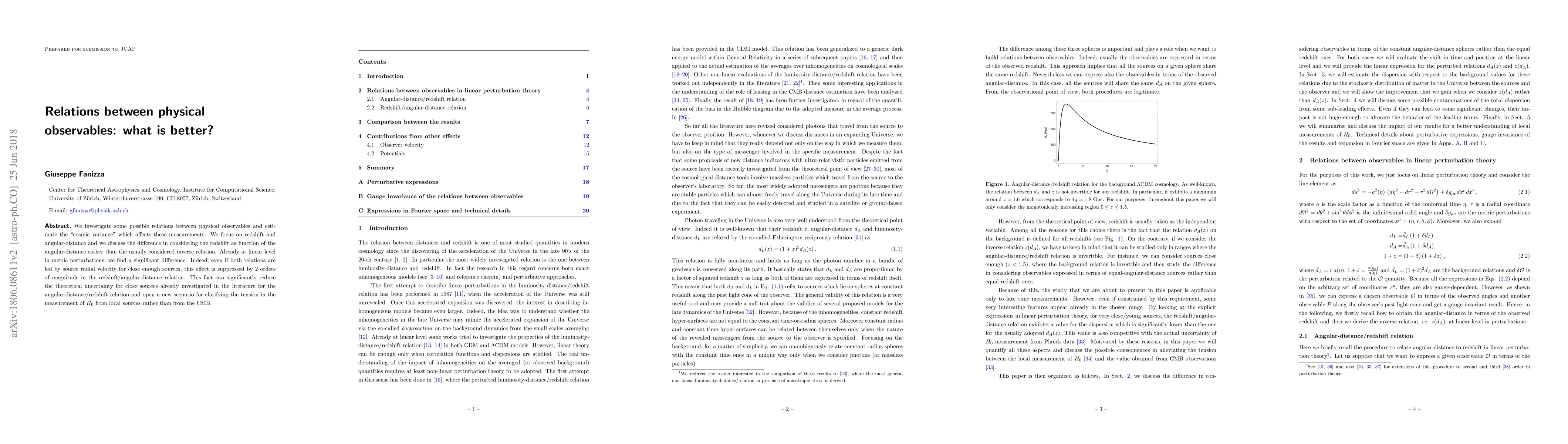 We investigate some possible relations between physical observables and estimate the "cosmic variance" which affects these measurements. We focus on redshift and angular-distance and we discuss the difference in considering the redshift as function of the angular-distance rather than the usually considered inverse relation. Already at linear level in metric perturbations, we find a significant difference. Indeed, even if both relations are led by source radial velocity for close enough sources, this effect is suppressed by 2 orders of magnitude in the redshift/angular-distance relation. This fact can significantly reduce the theoretical uncertainty for close sources already investigated in the literature for the angular-distance/redshift relation and open a new scenario for clarifying the tension in the measurement of $H_0$ from local sources rather than from the CMB.
