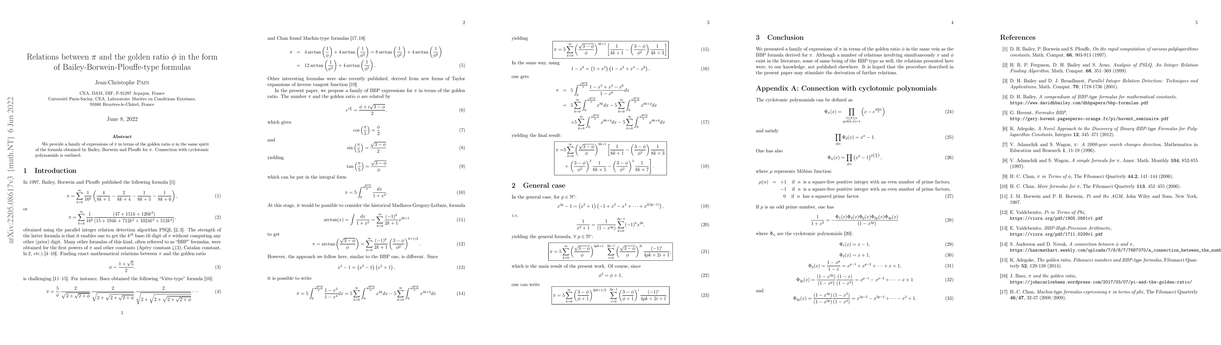 We provide a family of expressions of $\pi$ in terms of the golden ratio $\phi$ in the same spirit of the formula obtained by Bailey, Borwein and Plouffe for $\pi$. Connection with cyclotomic polynomials is outlined.