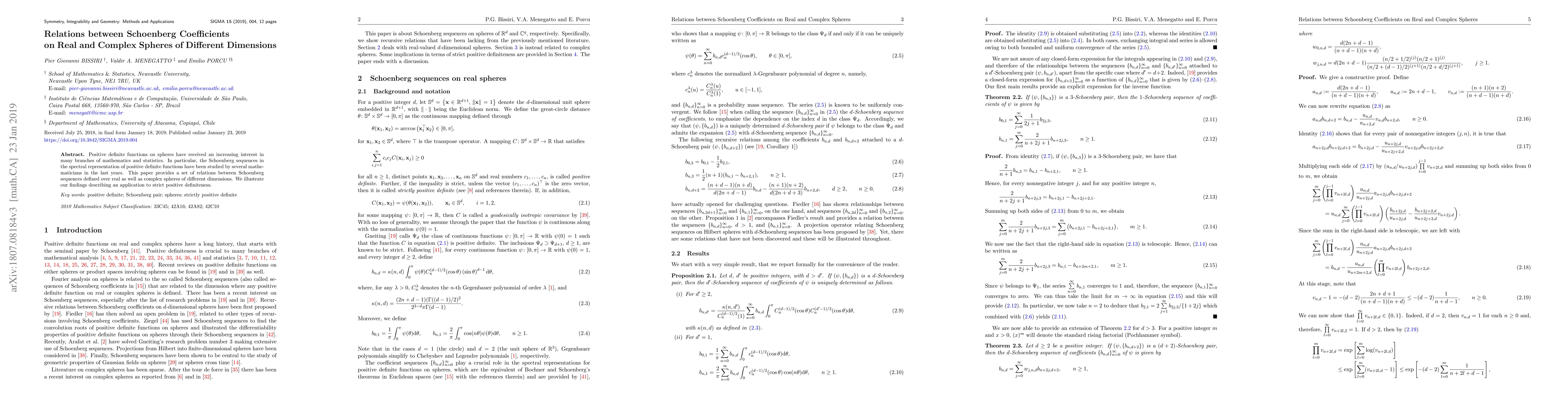 This paper establishes relationships between Schoenberg sequences on real and complex spheres of varying dimensions, highlighting their significance in the spectral representation of positive definite functions and demonstrating an application to strict positive definiteness.