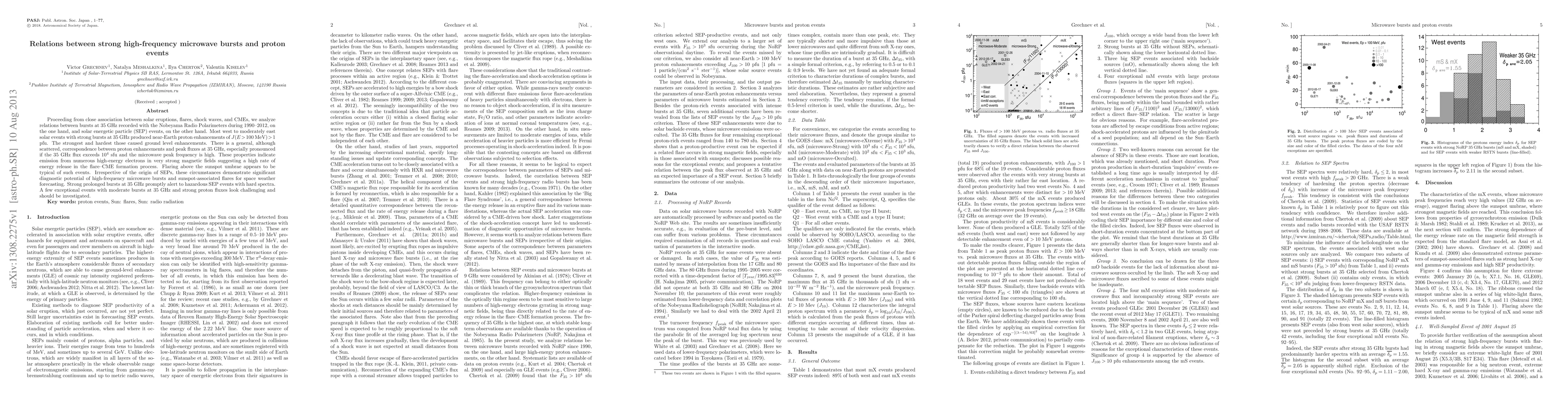 Proceeding from close association between solar eruptions, flares, shock waves, and CMEs, we analyze relations between bursts at 35 GHz recorded with the Nobeyama Radio Polarimeters during 1990-2012, on the one hand, and solar energetic particle (SEP) events, on the other hand. Most west to moderately east solar events with strong bursts at 35 GHz produced near-Earth proton enhancements of J(E > 100 MeV) > 1 pfu. The strongest and hardest those caused ground level enhancements. There is a general, although scattered, correspondence between proton enhancements and peak fluxes at 35 GHz, especially pronounced if the 35 GHz flux exceeds 10^4 sfu and the microwave peak frequency is high. These properties indicate emission from numerous high-energy electrons in very strong magnetic fields suggesting a high rate of energy release in the flare-CME formation process. Flaring above the sunspot umbrae appears to be typical of such events. Irrespective of the origin of SEPs, these circumstances demonstrate significant diagnostic potential of high-frequency microwave bursts and sunspot-associated flares for space weather forecasting. Strong prolonged bursts at 35 GHz promptly alert to hazardous SEP events with hard spectra. A few exceptional events with moderate bursts at 35 GHz and strong proton fluxes look challenging and should be investigated.