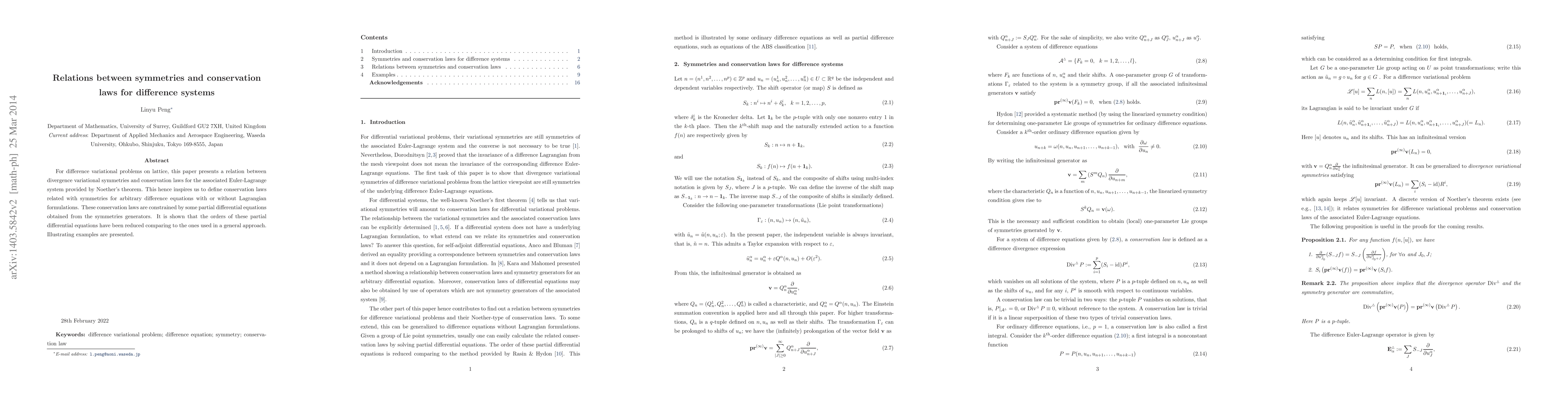 This paper establishes a link between variational symmetries and conservation laws for difference systems, derived from Noether's theorem, and generalizes this relationship to arbitrary difference equations, reducing the order of associated partial differential equations. Examples demonstrate the practical application of these findings.