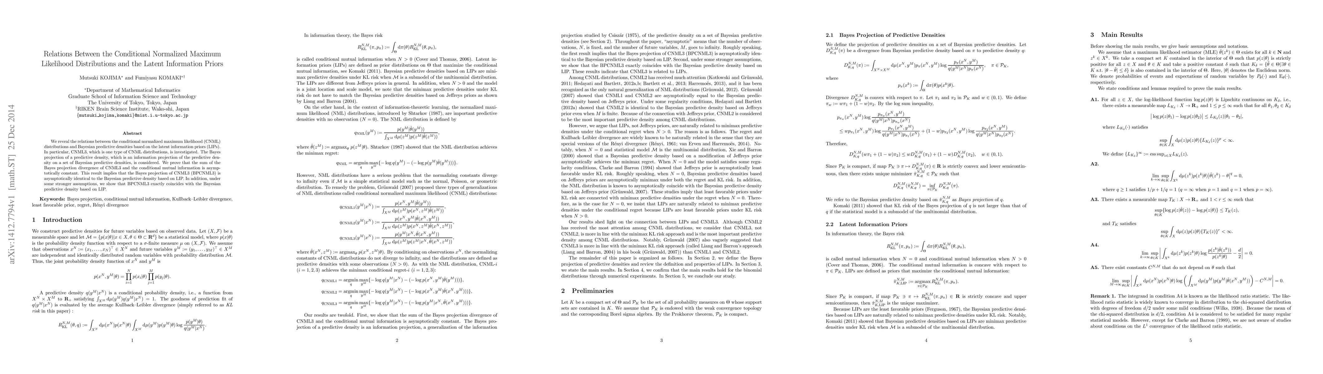 This paper explores the relationship between conditional normalized maximum likelihood (CNML) distributions and Bayesian predictive densities derived from latent information priors (LIPs). It demonstrates that the Bayes projection of CNML3 is asymptotically identical to the Bayesian predictive density based on LIPs, and under stronger assumptions, they exactly coincide.