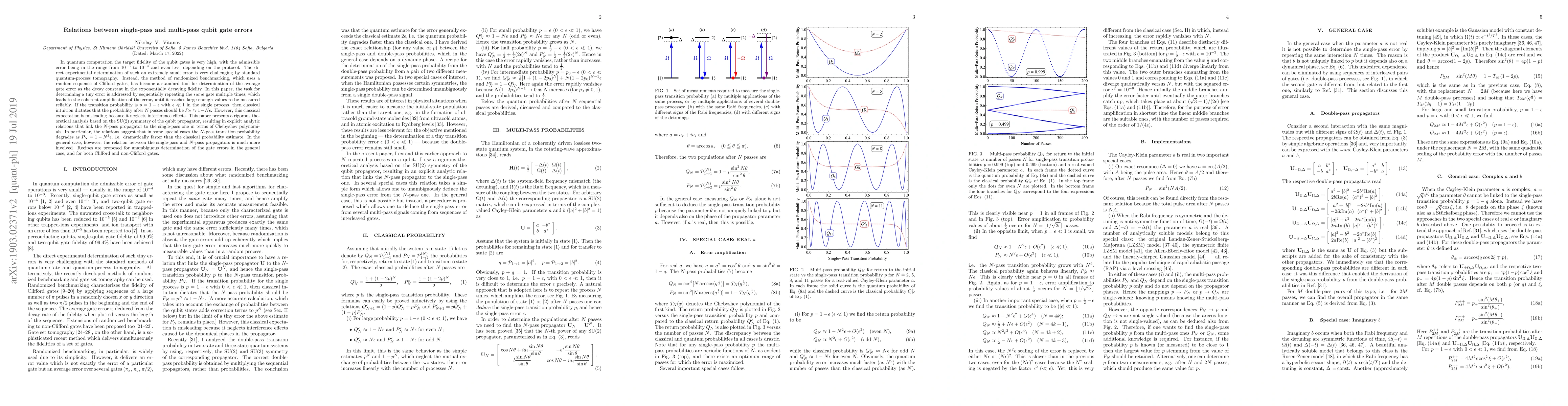 In quantum computation the target fidelity of the qubit gates is very high, with the admissible error being in the range from $10^{-3}$ to $10^{-4}$ and even less, depending on the protocol. The direct experimental determination of such an extremely small error is very challenging by standard quantum-process tomography. Instead, the method of randomized benchmarking, which uses a random sequence of Clifford gates, has become a standard tool for determination of the average gate error as the decay constant in the exponentially decaying fidelity. In this paper, the task for determining a tiny error is addressed by sequentially repeating the \emph{same} gate multiple times, which leads to the coherent amplification of the error, until it reaches large enough values to be measured reliably. If the transition probability is $p=1-\epsilon$ with $\epsilon \ll 1$ in the single process, then classical intuition dictates that the probability after $N$ passes should be $P_N \approx 1 - N \epsilon$. However, this classical expectation is misleading because it neglects interference effects. This paper presents a rigorous theoretical analysis based on the SU(2) symmetry of the qubit propagator, resulting in explicit analytic relations that link the $N$-pass propagator to the single-pass one in terms of Chebyshev polynomials. In particular, the relations suggest that in some special cases the $N$-pass transition probability degrades as $P_N = 1-N^2\epsilon$, i.e. dramatically faster than the classical probability estimate. In the general case, however, the relation between the single-pass and $N$-pass propagators is much more involved. Recipes are proposed for unambiguous determination of the gate errors in the general case, and for both Clifford and non-Clifford gates.
