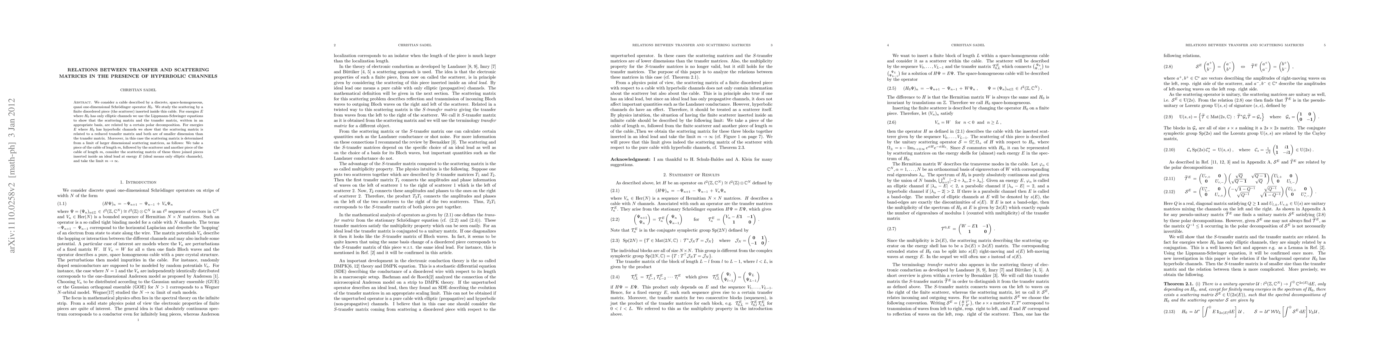 We consider a cable described by a discrete, space-homogeneous, quasi one-dimensional Schr\"odinger operator $H_0$. We study the scattering by a finite disordered piece (the scatterer) inserted inside this cable. For energies $E$ where $H_0$ has only elliptic channels we use the Lippmann-Schwinger equations to show that the scattering matrix and the transfer matrix, written in an appropriate basis, are related by a certain polar decomposition. For energies $E$ where $H_0$ has hyperbolic channels we show that the scattering matrix is related to a reduced transfer matrix and both are of smaller dimension than the transfer matrix. Moreover, in this case the scattering matrix is determined from a limit of larger dimensional scattering matrices, as follows: We take a piece of the cable of length $m$, followed by the scatterer and another piece of the cable of length $m$, consider the scattering matrix of these three joined pieces inserted inside an ideal lead at energy $E$ (ideal means only elliptic channels), and take the limit $m\to\infty$.