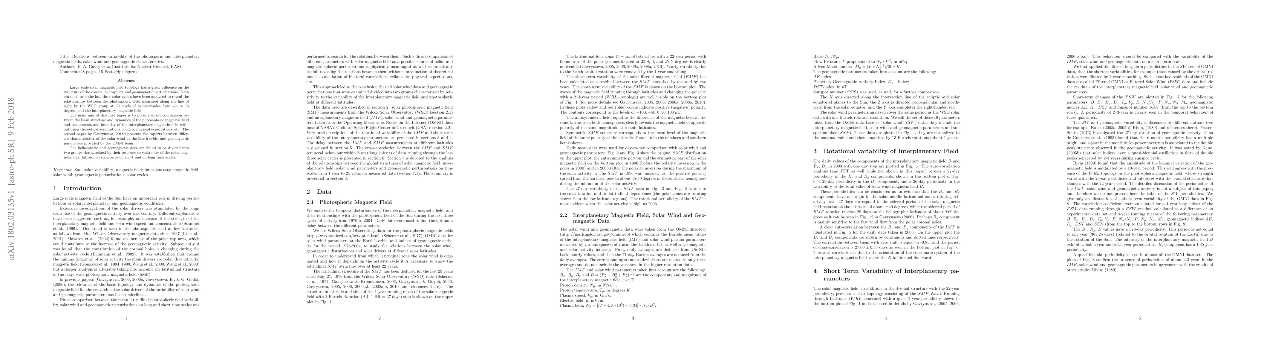This research analyzes the relationships between the variability of the photospheric and interplanetary magnetic fields, solar wind, and geomagnetic characteristics over the last three solar cycles. It finds two distinct groups of heliospheric and geomagnetic data based on their response to the solar magnetic field's latitudinal variability on different time scales.