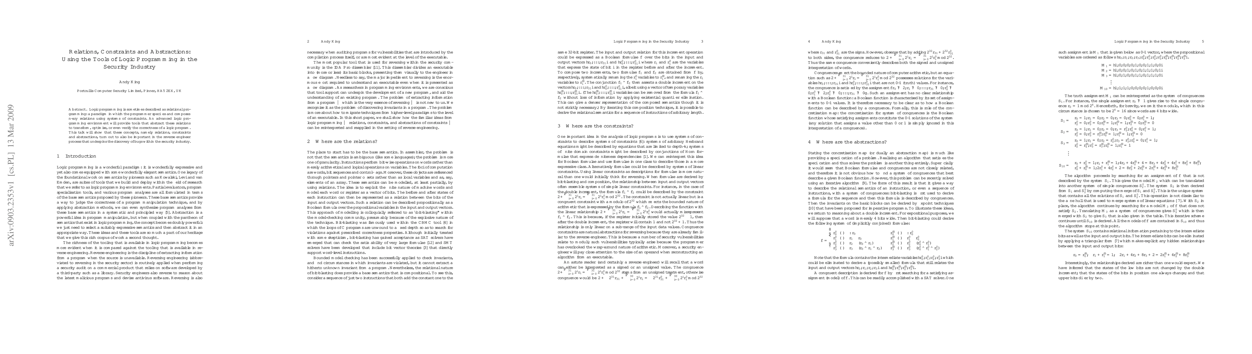 Logic programming is sometimes described as relational programming: a paradigm in which the programmer specifies and composes n-ary relations using systems of constraints. An advanced logic programming environment will provide tools that abstract these relations to transform, optimise, or even verify the correctness of a logic program. This talk will show that these concepts, namely relations, constraints and abstractions, turn out to also be important in the reverse engineer process that underpins the discovery of bugs within the security industry.