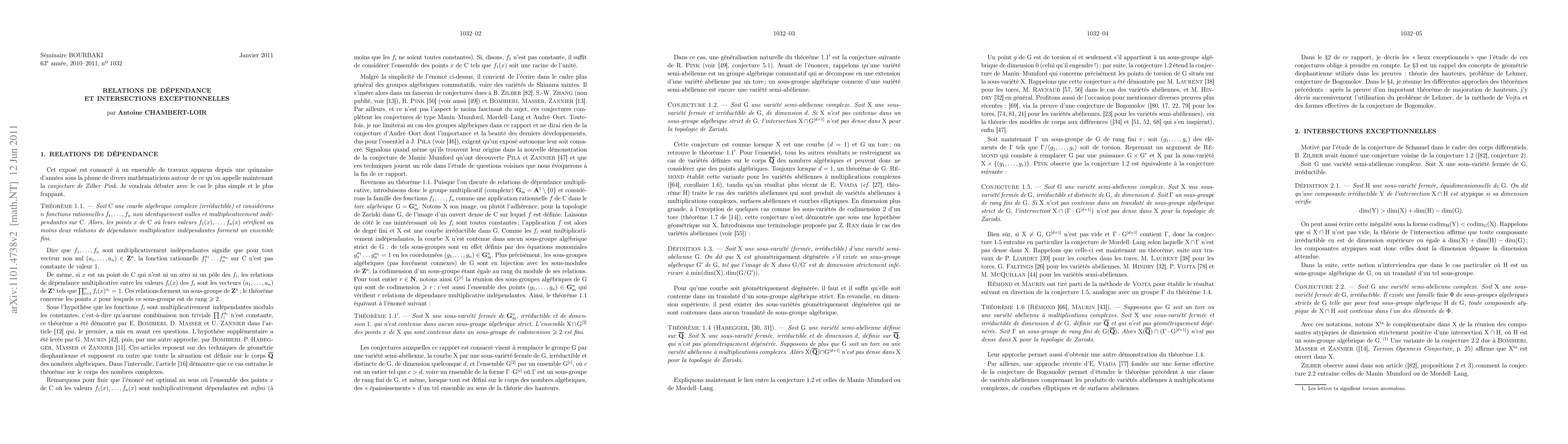 This text is devoted to the following result, stemming out works of Bombieri, Masser, Zannier, and Maurin: Let $X$ be an complex algebraic (projective, connected) curve and let us consider $n$ rational functions $f_1,...,f_n$ on $X$ which are multiplicatively independent. The points $x$ of $X$ where their values $f_1(x),...,f_n(x)$ satisfy at least two independent multiplicative dependence relations form a finite set. We discuss the conjectural generalizations of this theorem (Bombieri, Masser, Zannier; Zilber; Pink) concerning the finiteness of points of a $d$-dimensional subvariety $X$ of a semiabelian variety $G$ which belong to an algebraic subgroup of codimension $>d$ of $G$, their relations with theorems of Mordell-Lang or Manin-Mumford type, and, in the arithmetic case, recent results in this direction (Habegger; R\'emond; Viada). ----- Ce texte est consacr\'e au r\'esultat suivant, issus des travaux de Bombieri, Masser, Zannier et Maurin: Soit $X$ une courbe alg\'ebrique (projective, connexe) complexe et consid\'erons $n$ fonctions rationnelles $f_1,...,f_n$ multiplicativement ind\'ependantes sur $X$. Les points $x$ de $X$ o\`u leurs valeurs $f_1(x),...,f_n(x)$ v\'erifient au moins deux relations de d\'ependance multiplicative ind\'ependantes forment un ensemble fini. Nous discutons les g\'en\'eralisations conjecturales de ce th\'eor\`eme (Bombieri, Masser, Zannier; Zilber; Pink) concernant la finitude des points d'une sous-vari\'et\'e $X$ de dimension $d$ d'une vari\'et\'e semi-ab\'elienne $G$ qui appartiennent \`a un sous-groupe alg\'ebrique de codimension $>d$ dans $G$, leurs relations avec les th\'eor\`emes de type Mordell-Lang ou Manin-Mumford et, dans le cas arithm\'etique, les r\'esultats r\'ecents dans cette direction (Habegger; R\'emond; Viada).