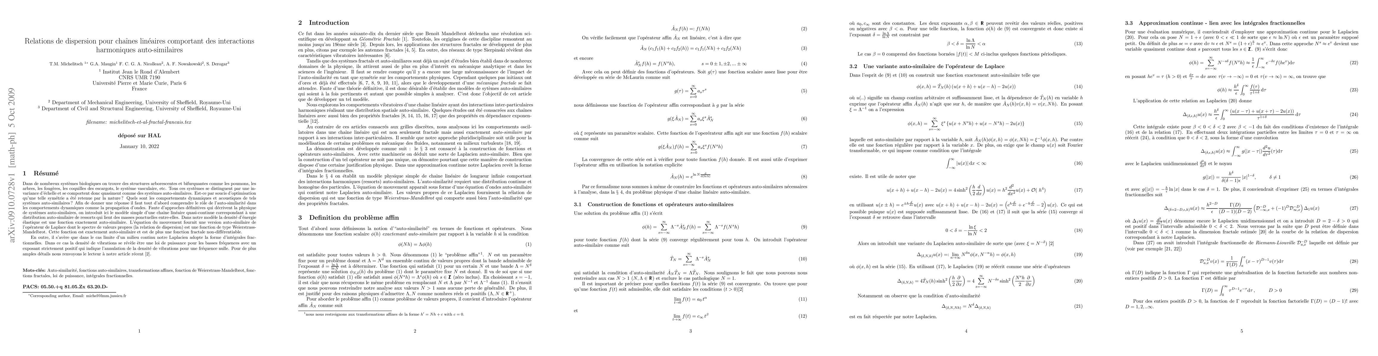 Many systems in nature have arborescent and bifurcated structures such as trees, fern, snails, lungs, the blood vessel system, etc. and look self-similar over a wide range of scales. Which are the mechanical and dynamic properties that evolution has optimized by choosing self-similarity? How can we describe the mechanics of self-similar structures in the static and dynamic framework? Physical systems with self-similarity as a symmetry property require the introduction of non-local particle-particle interactions and a (quasi-) continuous distribution of mass. We construct self-similar functions and linear operators such as a self-similar variant of the Laplacian and of the D'Alembertian wave operator. The obtained self-similar linear wave equation describes the dynamics of a quasi-continuous linear chain of infinite length with a spatially self-similar distribution of nonlocal inter-particle springs. The self-similarity of the nonlocal harmonic particle-particle interactions results in a dispersion relation of the form of a Weierstrass-Mandelbrot function which exhibits self-similar and fractal features. We deduce a continuum approximation that links the self-similar Laplacian to fractional integrals and which yields in the low-frequency regime a power law frequency dependence for the oscillator density. For details of the present model we refer to our recent paper (Michelitsch et al., Phys. Rev. E 80, 011135 (2009)).