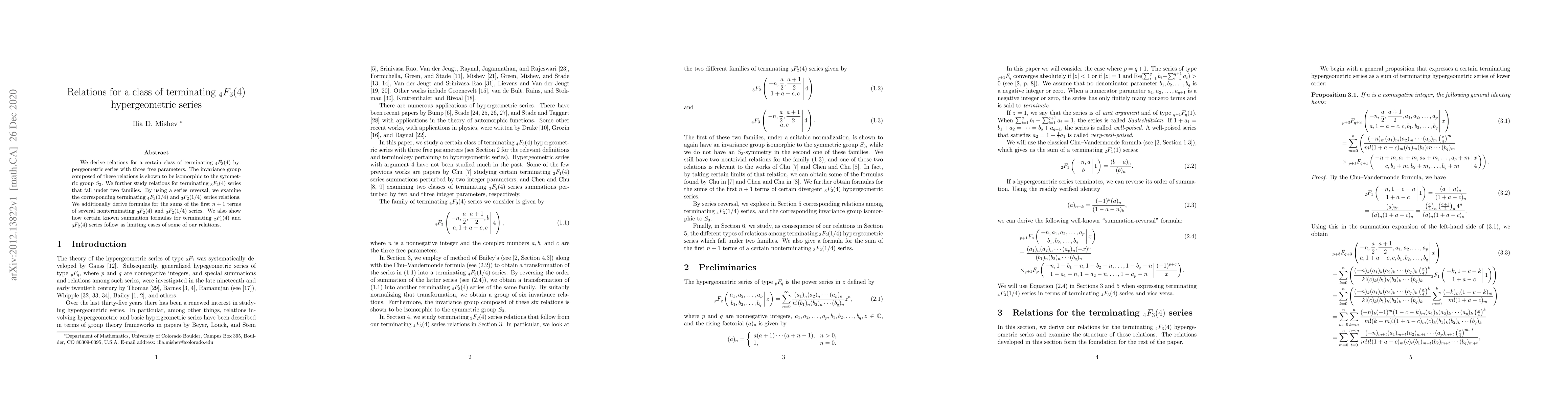 This paper derives relations for terminating ${}_4F_3(4)$ hypergeometric series with three free parameters, showing their invariance group is isomorphic to $S_3$. It also examines related terminating ${}_3F_2(4)$ series, deriving formulas for their sums and showing how known summation formulas for other series emerge as limiting cases.