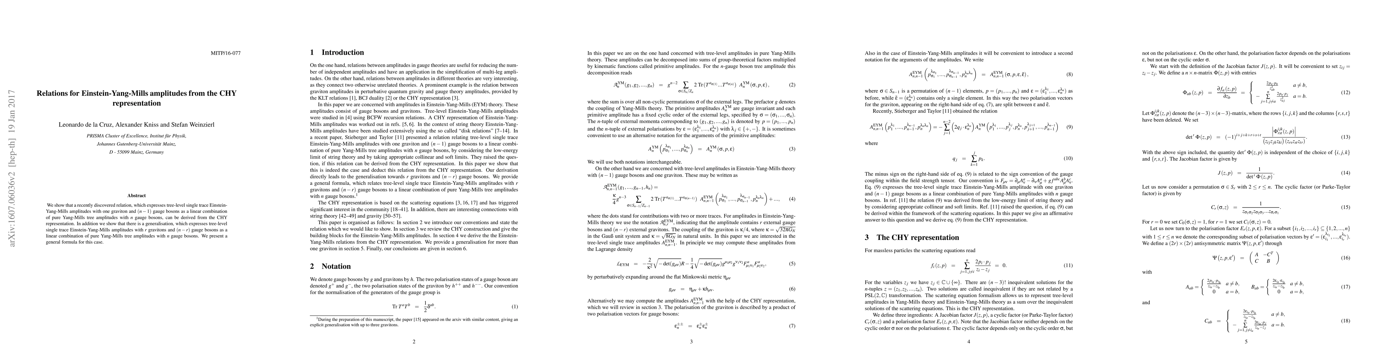 We show that a recently discovered relation, which expresses tree-level single trace Einstein-Yang-Mills amplitudes with one graviton and $(n-1)$ gauge bosons as a linear combination of pure Yang-Mills tree amplitudes with $n$ gauge bosons, can be derived from the CHY representation. In addition we show that there is a generalisation, which expresses tree-level single trace Einstein-Yang-Mills amplitudes with $r$ gravitons and $(n-r)$ gauge bosons as a linear combination of pure Yang-Mills tree amplitudes with $n$ gauge bosons. We present a general formula for this case.