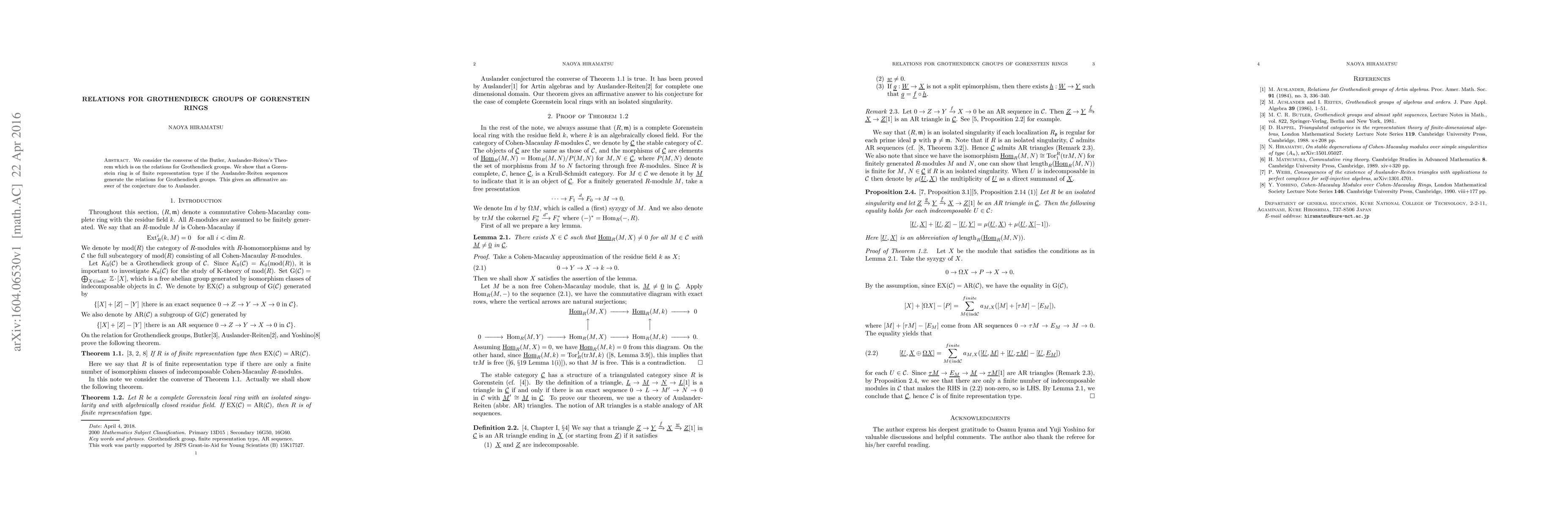 Summary: The paper investigates the relations for Grothendieck groups of Gorenstein rings, proving that such rings have finite representation type if Auslander-Reiten sequences generate these relations, thus confirming Auslander's conjecture.