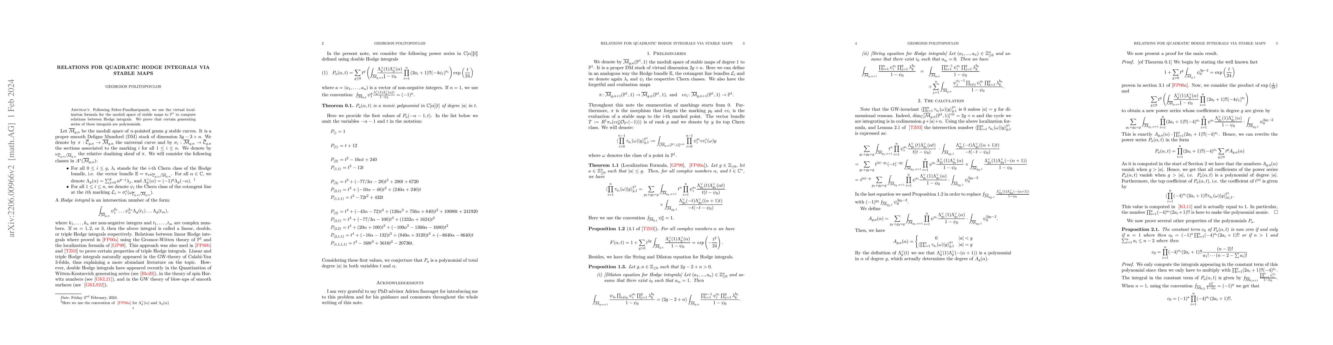 This paper utilizes the virtual localization formula on the moduli space of stable maps to $\mathbb{P}^1$ to establish relations for quadratic Hodge integrals, proving that certain generating series of these integrals are polynomial. The findings provide a new perspective on the structure of Hodge integrals.