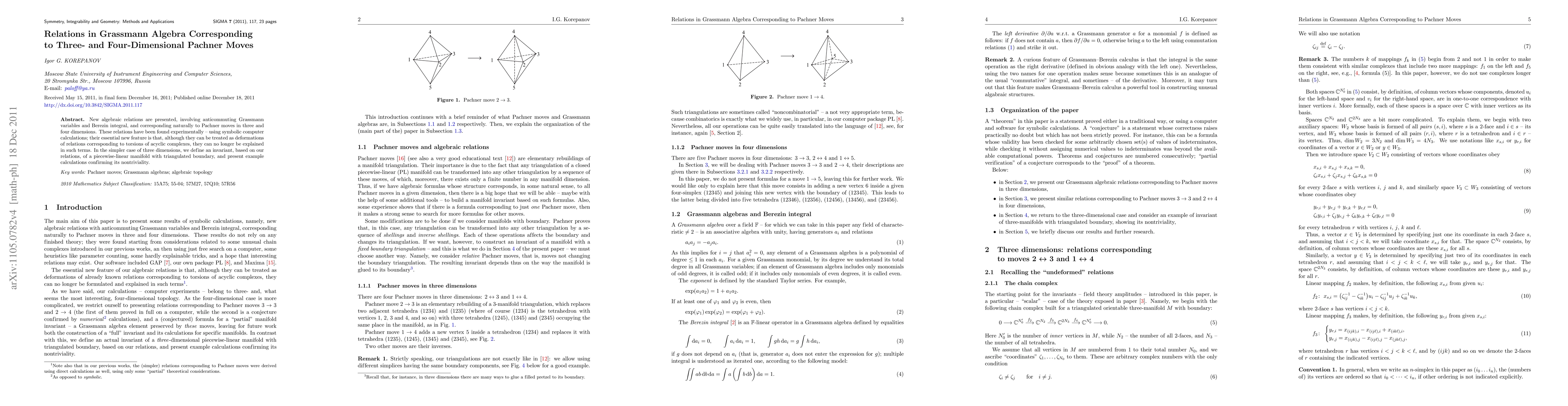 This paper introduces new algebraic relations in Grassmann algebra that correspond to three- and four-dimensional Pachner moves, discovered via symbolic computer calculations. These relations, though related to deformations of torsions of acyclic complexes, cannot be fully explained in such terms, and an invariant for three-dimensional piecewise-linear manifolds is defined and shown to be nontrivial through example calculations.