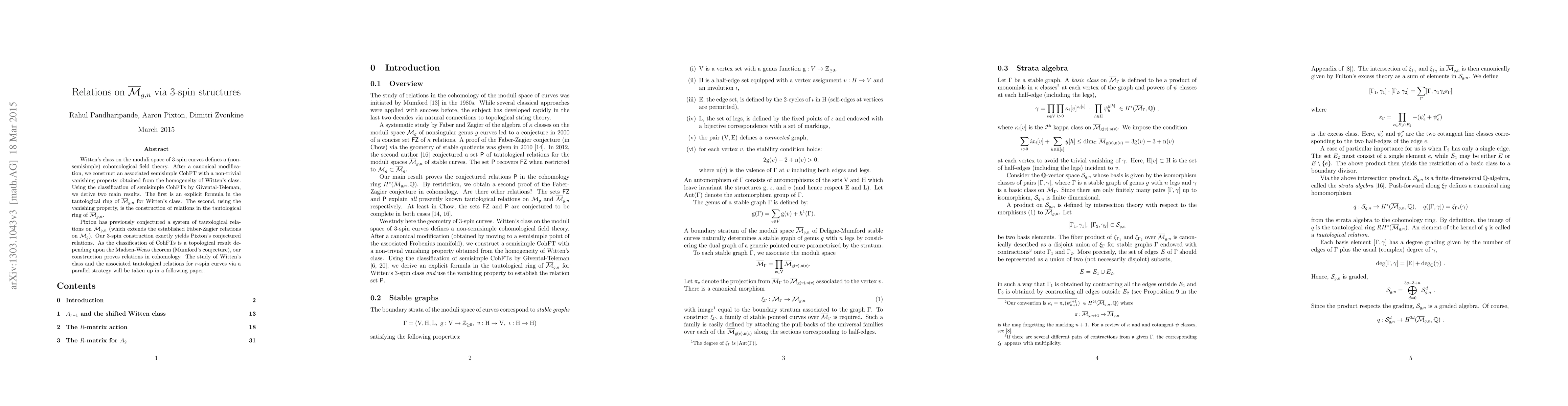 Witten's class on the moduli space of 3-spin curves defines a (non-semisimple) cohomological field theory. After a canonical modification, we construct an associated semisimple CohFT with a non-trivial vanishing property obtained from the homogeneity of Witten's class. Using the classification of semisimple CohFTs by Givental-Teleman, we derive two main results. The first is an explicit formula in the tautological ring of Mbar_{g,n} for Witten's class. The second, using the vanishing property, is the construction of relations in the tautological ring of Mbar_{g,n}. Pixton has previously conjectured a system of tautological relations on Mbar_{g,n} (which extends the established Faber-Zagier relations on M_g). Our 3-spin construction exactly yields Pixton's conjectured relations. As the classification of CohFTs is a topological result depending upon the Madsen-Weiss theorem (Mumford's conjecture), our construction proves relations in cohomology. The study of Witten's class and the associated tautological relations for r-spin curves via a parallel strategy will be taken up in a following paper.