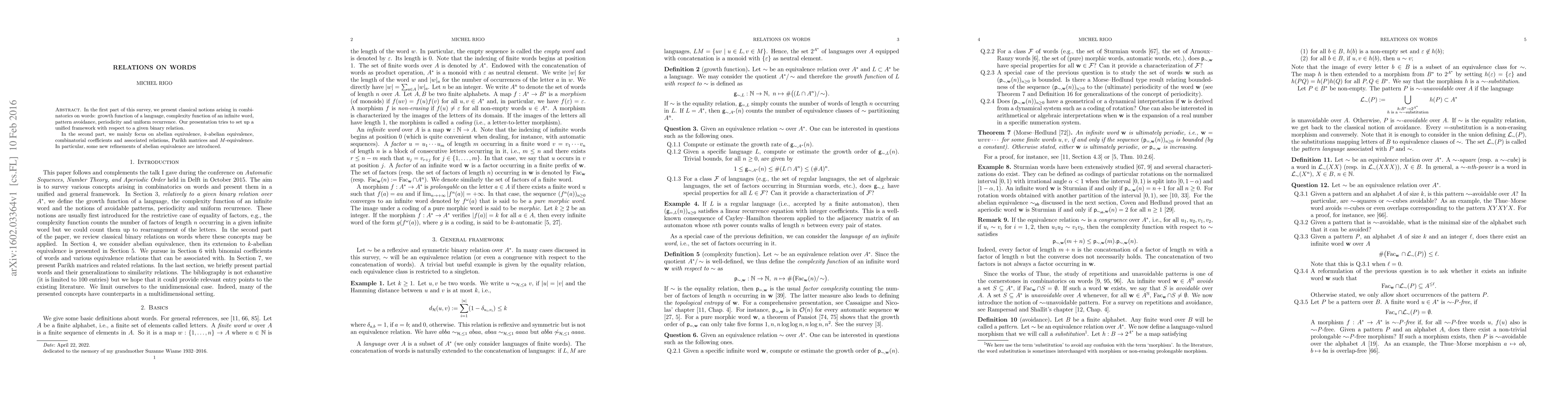 In the first part of this survey, we present classical notions arising in combinatorics on words: growth function of a language, complexity function of an infinite word, pattern avoidance, periodicity and uniform recurrence. Our presentation tries to set up a unified framework with respect to a given binary relation. In the second part, we mainly focus on abelian equivalence, $k$-abelian equivalence, combinatorial coefficients and associated relations, Parikh matrices and $M$-equivalence. In particular, some new refinements of abelian equivalence are introduced.